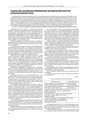 Предлагаемая статья посвящена обоснованию сущностных положений формирования экономической культуры курсантов морского университета. Цель исследования разработать научные положения формирования экономической культуры курсантов в процессе профессиональной подготовки в высшей морской школе. Методология исследования направлена на проведение обстоятельного теоретического анализа понятия «экономическая культура» и разработку сущностных основ его привития обучающимся в морском вузе. Исследование проводилось с применением совокупности педагогических методов: изучение литературы; теоретический анализ; синтез; интервью, беседы (индивидуальные, групповые); опрос; обобщение, конкретизация. Результат исследования - систематизированные сущностные положения формирования экономической культуры курсантов морского вуза. Разработанные научные положения обладают научной новизной, теоретической и практической значимостью. Они будут востребованы как для исследовательской деятельности, так и для организации и проведения целенаправленной учебно-воспитательной работы в высших и средних профессиональных учебных заведениях.