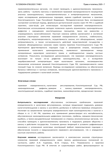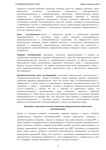 Актуальность исследования обусловлена системными проблемами правовой определенности в налоговом регулировании, которые продолжают подрывать доверие налогоплательщиков к закону и усугублять дисбаланс в публично-правовых отношениях. Несмотря на закрепление принципа определенности норм законодательства о налогах и сборах в ст. 3НК РФ, практика его применения демонстрирует его нестабильность, обусловленную законодательными дефектами (коллизии, пробелы, юридико-технические ошибки), а также расширительным толкованием со стороны уполномоченных органов, что способно приводить к административному произволу и подрывать доверие общества к закону и действиям государства. Усиление данных тенденций в условиях цифровизации экономики и усложнения налоговых конструкций требует переосмысления подходов к обеспечению ясности и предсказуемости правового регулирования, что и определяет научную значимость работы.