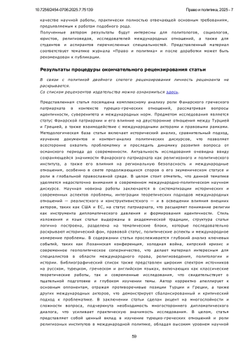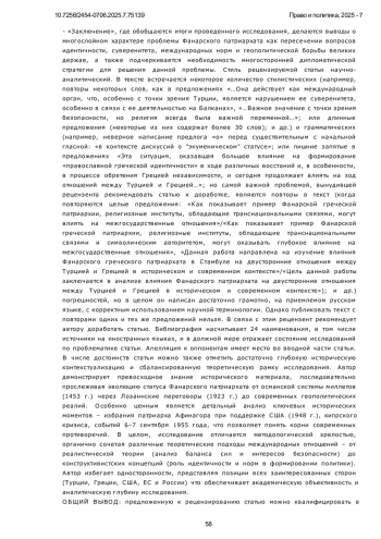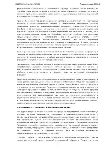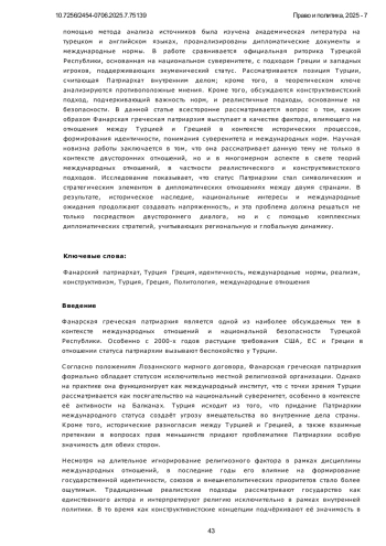 Роль Фанарского Патриархата в отношениях между Турцией и Грецией, рассматриваемая с исторической и теоретической точек зрения, является вопросом, лежащим на стыке идентичности, понимания суверенитета и международных норм. Вопрос о Патриархате во всех этих аспектах вызывает ряд различных проблем в отношениях между Турцией и Грецией. Турция, в рамках Лозаннского договора, рассматривает Патриархию как местную религиозную институцию, обслуживающую греческое православное меньшинство в Стамбуле, в то время как Греция и западные игроки, утверждая, что Патриархия является «экуменической», поддерживают этот статус и выносят вопрос на международный уровень. В данной статье принят качественный подход. В работе исторические события интерпретируются с учетом конструктивистской и реалистической перспектив теорий международных отношений. С помощью метода анализа источников была изучена академическая литература на турецком и английском языках, проанализированы дипломатические документы и международные нормы. В работе сравнивается официальная риторика Турецкой Республики, основанная на национальном суверенитете, с подходом Греции и западных игроков, поддерживающих экуменический статус. Рассматривается позиция Турции, считающая Патриархат внутренним делом; кроме того, в теоретическом ключе анализируются противоположные мнения. Кроме того, обсуждаются конструктивистский подход, подчеркивающий важность норм, и реалистичные подходы, основанные на безопасности. В данной статье всесторонне рассматривается вопрос о том, каким образом Фанарская греческая патриархия выступает в качестве фактора, влияющего на отношения между Турцией и Грецией в контексте исторических процессов, формирования идентичности, понимания суверенитета и международных норм. Научная новизна работы заключается в том, что она рассматривает данную тему не только в контексте двусторонних отношений, но и в многомерном аспекте в свете теорий международных отношений, в частности реалистического и конструктивистского подходов. Исследование показывает, что статус Патриархии стал символическим и стратегическим элементом в дипломатических отношениях между двумя странами. В результате, историческое наследие, национальные интересы и международные ожидания продолжают создавать напряженность, и эта проблема должна решаться не только посредством двустороннего диалога, но и с помощью комплексных дипломатических стратегий, учитывающих региональную и глобальную динамику.