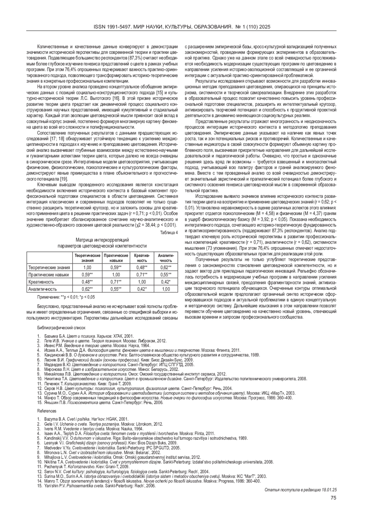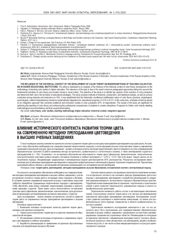 Статья посвящена анализу влияния исторического контекста развития теории цвета на методику преподавания цветоведения в высшей школе. Актуальность темы обусловлена необходимостью совершенствования педагогических подходов с учетом фундаментальных основ цветовой теории и современных тенденций в визуальной культуре. Цель исследования - выявить ключевые аспекты эволюции представлений о цвете и определить их роль в формировании образовательных стратегий. В работе применены методы исторического, сравнительного и статистического анализа, а также анкетирование студентов и преподавателей (n = 154). Установлено, что исторически обусловленная многогранность теории цвета (физическая, физиологическая, психологическая, культурологическая трактовки) должна находить системное отражение в учебных программах (r = 0,78; p < 0,01). При этом акцент следует делать на интегративном подходе, объединяющем традиционные и инновационные модели цветовосприятия (61% респондентов). Результаты исследования имеют значение для оптимизации преподавания цветоведения и повышения профессиональных компетенций учащихся творческих специальностей. Перспективы дальнейшей работы связаны с детализацией методических рекомендаций и их экспериментальной апробацией.