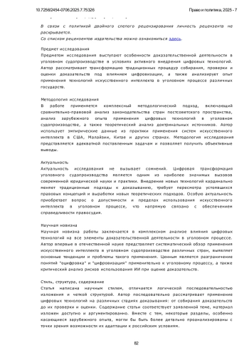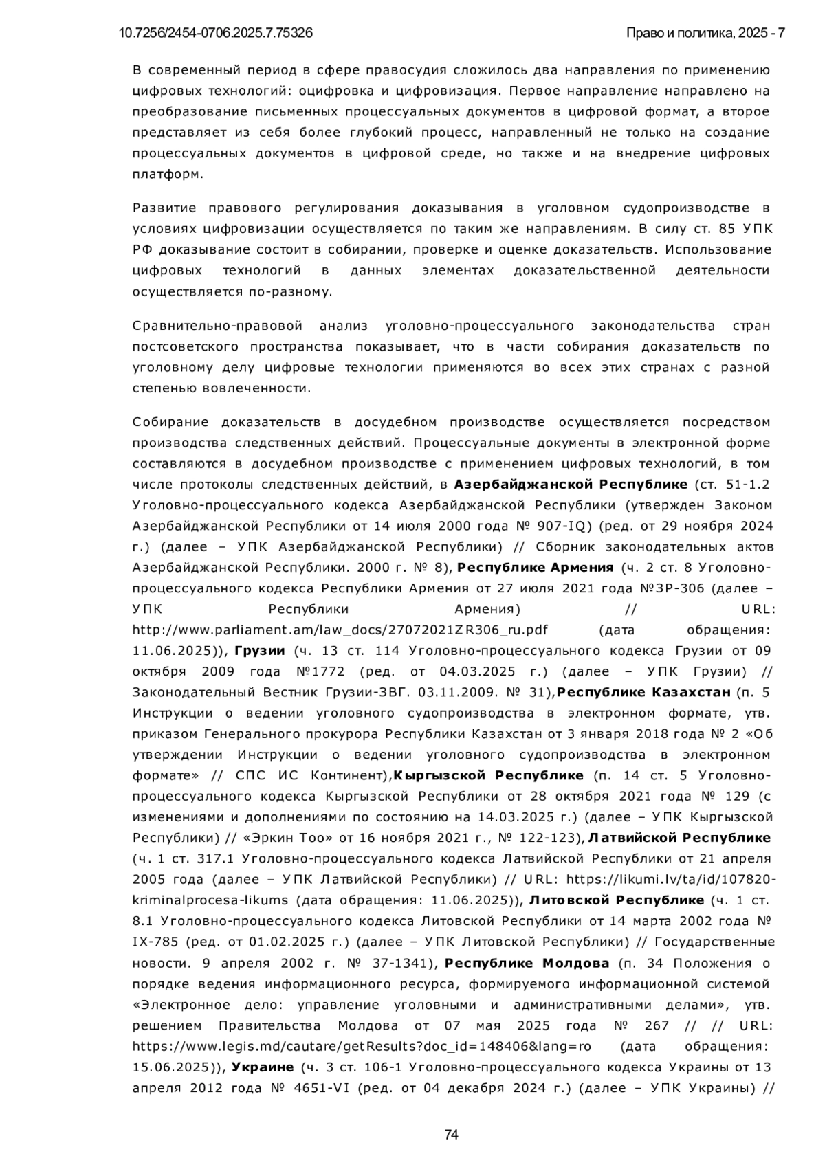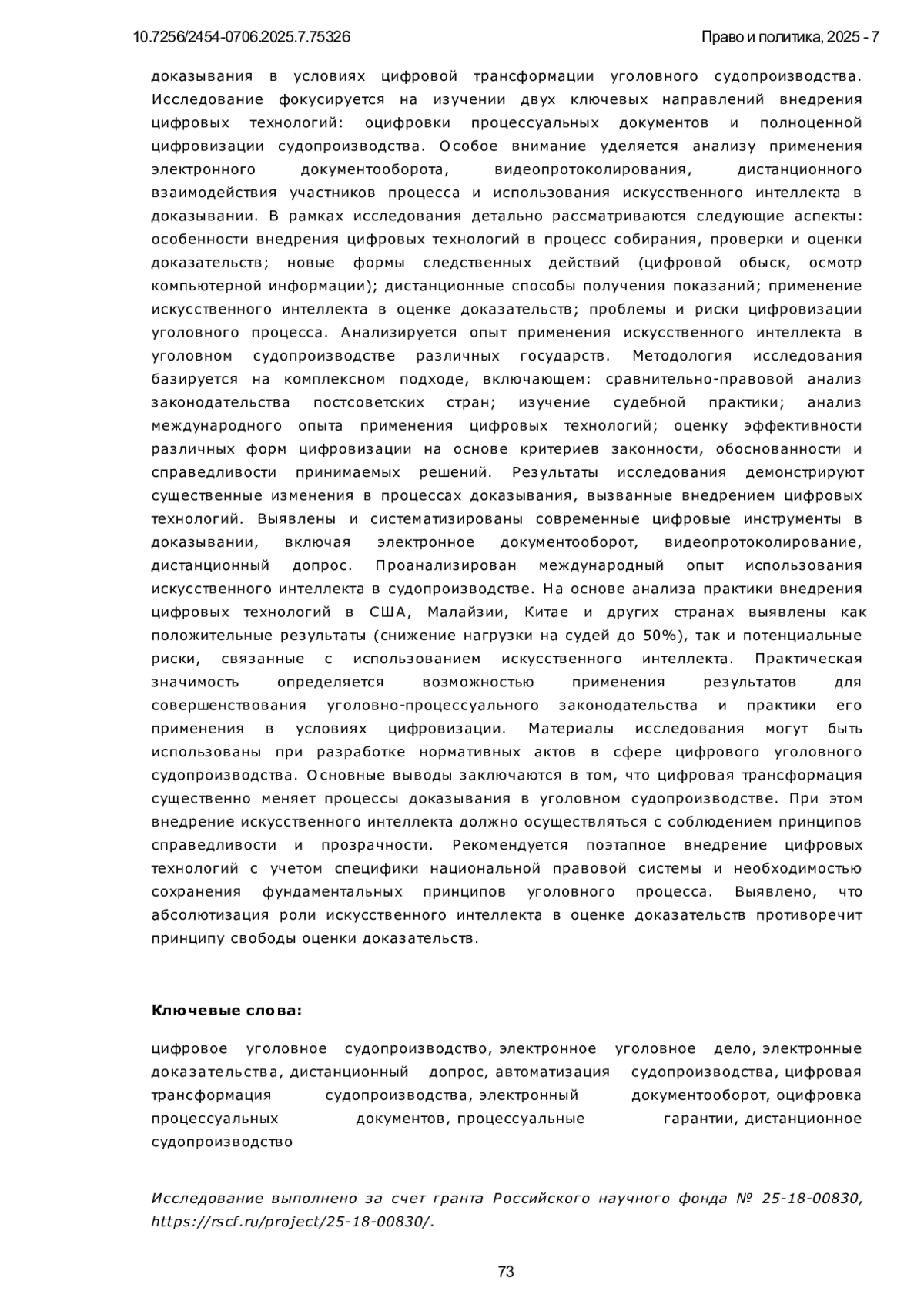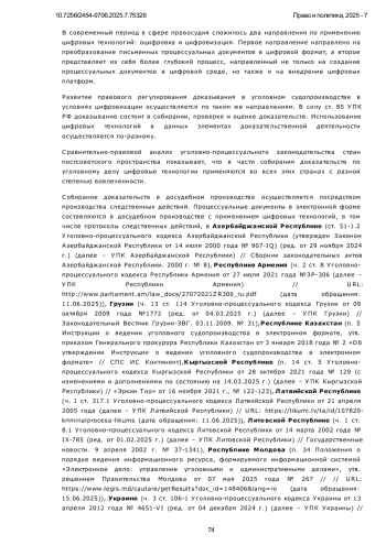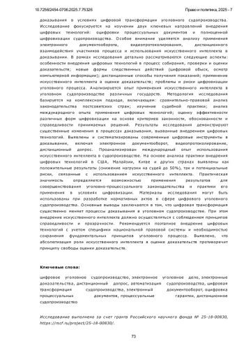 Предмет исследования охватывает комплексный анализ процессов доказывания в условиях цифровой трансформации уголовного судопроизводства. Исследование фокусируется на изучении двух ключевых направлений внедрения цифровых технологий: оцифровки процессуальных документов и полноценной цифровизации судопроизводства. Особое внимание уделяется анализу применения электронного документооборота, видеопротоколирования, дистанционного взаимодействия участников процесса и использования искусственного интеллекта в доказывании. В рамках исследования детально рассматриваются следующие аспекты: особенности внедрения цифровых технологий в процесс собирания, проверки и оценки доказательств; новые формы следственных действий (цифровой обыск, осмотр компьютерной информации); дистанционные способы получения показаний; применение искусственного интеллекта в оценке доказательств; проблемы и риски цифровизации уголовного процесса. Анализируется опыт применения искусственного интеллекта в уголовном судопроизводстве различных государств. Методология исследования базируется на комплексном подходе, включающем: сравнительно-правовой анализ законодательства постсоветских стран; изучение судебной практики; анализ международного опыта применения цифровых технологий; оценку эффективности различных форм цифровизации на основе критериев законности, обоснованности и справедливости принимаемых решений. Результаты исследования демонстрируют существенные изменения в процессах доказывания, вызванные внедрением цифровых технологий. Выявлены и систематизированы современные цифровые инструменты в доказывании, включая электронное документооборот, видеопротоколирование, дистанционный допрос. Проанализирован международный опыт использования искусственного интеллекта в судопроизводстве. На основе анализа практики внедрения цифровых технологий в США, Малайзии, Китае и других странах выявлены как положительные результаты (снижение нагрузки на судей до 50%), так и потенциальные риски, связанные с использованием искусственного интеллекта. Практическая значимость определяется возможностью применения результатов для совершенствования уголовно-процессуального законодательства и практики его применения в условиях цифровизации. Материалы исследования могут быть использованы при разработке нормативных актов в сфере цифрового уголовного судопроизводства. Основные выводы заключаются в том, что цифровая трансформация существенно меняет процессы доказывания в уголовном судопроизводстве. При этом внедрение искусственного интеллекта должно осуществляться с соблюдением принципов справедливости и прозрачности. Рекомендуется поэтапное внедрение цифровых технологий с учетом специфики национальной правовой системы и необходимостью сохранения фундаментальных принципов уголовного процесса. Выявлено, что абсолютизация роли искусственного интеллекта в оценке доказательств противоречит принципу свободы оценки доказательств.