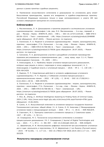 7. Wei, B., Zheng, Z. Artificial Intelligence Assisting to Finding Facts of Criminal Cases, 2024 // URL: http://www.socio-legal.sjtu.edu.cn/en/wxzy/info.aspx?itemid=4706 (дата обращения: 15.06.2025).