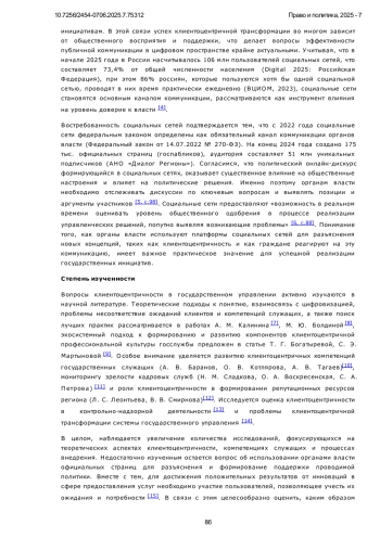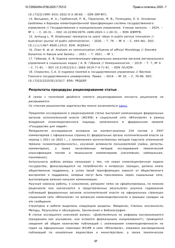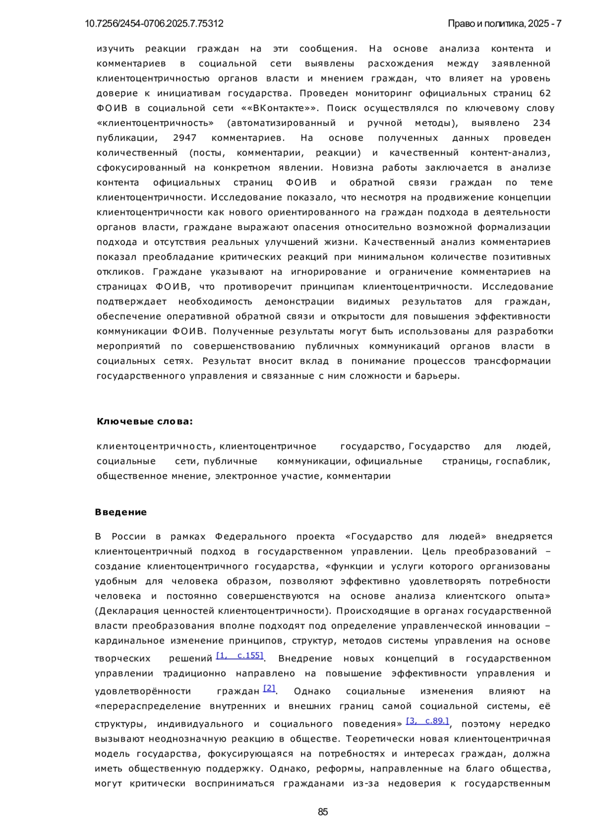 РОСЛЯКОВА М. В. КЛИЕНТОЦЕНТРИЧНОСТЬ В ГОСУДАРСТВЕННОМ УПРАВЛЕНИИ: КОММУНИКАЦИИ ОРГАНОВ ВЛАСТИ И РЕАКЦИЯ ГРАЖДАН В СОЦИАЛЬНОЙ СЕТИ «ВКОНТАКТЕ» // ПРАВО И ПОЛИТИКА. 2025. № 7