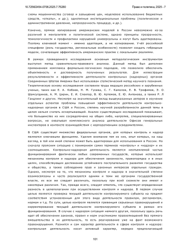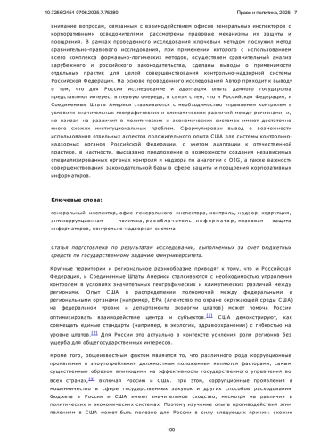 Статья посвящена изучению специфики организации контрольно-надзорной деятельности в США и выявлению возможности использования наиболее эффективных аспектов американского опыта в данной сфере для совершенствования государственного контроля и надзора в Российской Федерации. Целью исследования является определение отдельных характеристик системы контрольно-надзорных органов США, влияющих на её эффективность и оценка их применимости для совершенствования работы аналогичных органов в России. Основной акцент сделан на исследование организации работы офисов генеральных инспекторов (OIG) действующих в федеральных исполнительных департаментах, независимых федеральных агентствах, комиссиях, а также предприятиях, финансируемых правительством США. Уделено внимание вопросам, связанным с взаимодействием офисов генеральных инспекторов с корпоративными осведомителями, рассмотрены правовые механизмы их защиты и поощрения. В рамках проведенного исследования ключевым методом послужил метод сравнительно-правового исследования, при применении которого с использованием всего комплекса формально-логических методов, осуществлен сравнительный анализ зарубежного и российского законодательства, сделаны выводы о применимости отдельных практик для целей совершенствования контрольно-надзорной системы Российской Федерации. На основе проведенного исследования Автор приходит к выводу о том, что для России исследование и адаптация опыта данного государства представляют интерес, в первую очередь, в связи с тем, что и Российская Федерация, и Соединенные Штаты Америки сталкиваются с необходимостью управления контролем в условиях значительных географических и климатических различий между регионами, и, не взирая на различия в политических и экономических системах имеют достаточно много схожих институциональных проблем. Сформулирован вывод о возможности использования отдельных аспектов положительного опыта США для системы контрольно-надзорных органов Российской Федерации, с учетом адаптации к отечественной практике, в частности, высказано предложение о возможности создания независимых специализированных органах контроля и надзора по аналогии с OIG, а также важности совершенствования законодательной базы в сфере защиты и поощрения корпоративных информаторов.