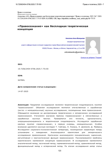Предметом исследования является теоретическая плодотворность понятия “правосознание”. Объектом исследования являются отечественные и зарубежные (англо- и немецкоязычные) научные исследования, посвященные теме правосознания. Обращается внимание на диспропорцию теоретических и эмпирических исследований правосознания. Уточняется значение термина «правосознание» в отечественных и зарубежных научных текстах. Проверяется его точность, однозначность, операционализируемость и теоретическая плодотворность. Исследуется зарубежная критика понятия «правосознание», в первую очередь, немецкоязычная. Особое внимание уделяется научным взглядам Т. Гайгера, Н. Лумана, Н. Диммеля, Д. Майерса. Исследуется социолого-психологическая литература, посвященная корреляции между установками и поведением. Анализируются препятствия для эмпирического исследования правосознания. Критически анализируются познавательная, оценочная, регулятивная и прогностическая функция правосознания. Рассматриваются проблемы практического применения концепции правосознания. В исследовании применяются аналитический метод, логический метод, герменевтический метод, сравнительный метод, функциональный метод и исторический метод. По итогам исследования автор статьи пришёл к следующим выводам. Во-первых, правосознание представляет собой слишком широкий объект и предмет как для теоретического, так и для эмпирического исследования. Во-вторых, правосознание с трудом поддается эмпирическому изучению по методологическим причинам. В-третьих, научные суждения о правосознании носят практически неизбежно оценочный и субъективный характер. В четвертых, выполнение правосознанием регулятивной функции не может быть доказано, основываясь на данных современных социолого-психологических исследований. Главная причина лежит в недостаточной изученности корреляции между установками индивида и его поведением. В пятых, как следствие, правосознание не несет прогностической функции. В шестых, концепция правосознания не содержит в себе ни теоретической, ни практической ценности. В седьмых, термин “правосознание” широко используется в политических и идеологических целях. Данные критические выводы содержат в себе научную новизну, поскольку идут вразрез с преимущественно положительной оценкой теоретической значимости понятия “правосознание” в отечественных научных публикациях.