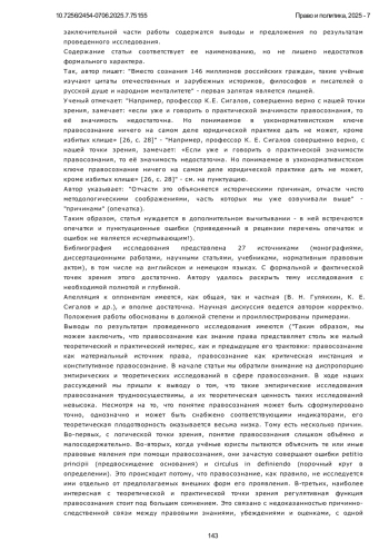 26. Сигалов К.Е. Правосознание в контексте комплекса правовых методологий // Исторические трансформации правосознания в пространстве различных традиций права (памяти профессора В.М. Курицина): Международная научно-практическая конференция, 22-23 декабря 2022 г. - М.: Московский университет МВД России имени В.Я. Кикотая, 2023. - С. 28-31.