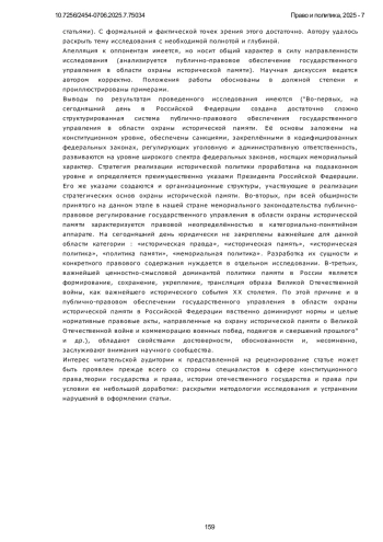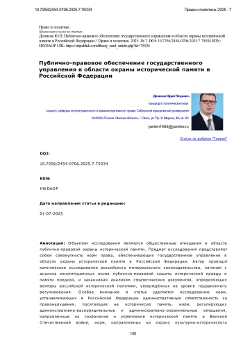 В современной российской публично-правовой науке всё активнее осмысливается важность регулирования охраны исторической памяти. С одной стороны, своего рода «мемориальный поворот» в российском публичном праве явился одним из следствий изменений в Конституции Российской Федерации, одобренных в ходе общероссийского голосования 01 июля 2020 года. В частности, его связывают с новым нормативным предписанием Конституции РФ, направленным «на укрепление духовно-нравственных ценностей российского общества и выражение в Конституции РФ культурновоспитательной функции государства». [1, с. 30]. Оно нашло своё отражение в новой конституционной норме, части 3 статьи 67.1, которая гласит: «Российская Федерация чтит память защитников Отечества, обеспечивает защиту исторической правды».