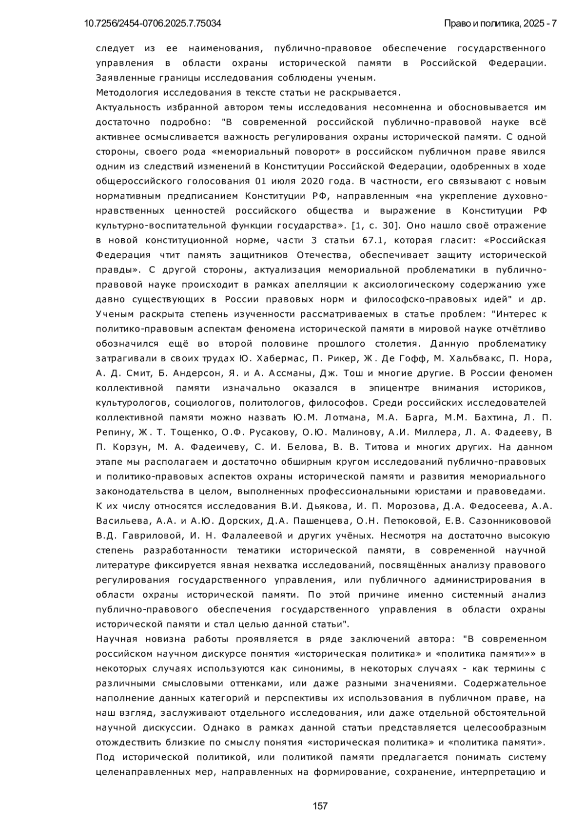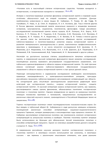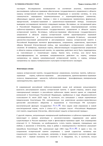 2. Петюкова О.Н. Преемственность в сохранении исторической памяти как основа обеспечения государственного суверенитета России // Журнал российского права. - 2025. - Т. 29. - № 4. - С. 32-47. DOI: 10.61205/S160565900034120-6