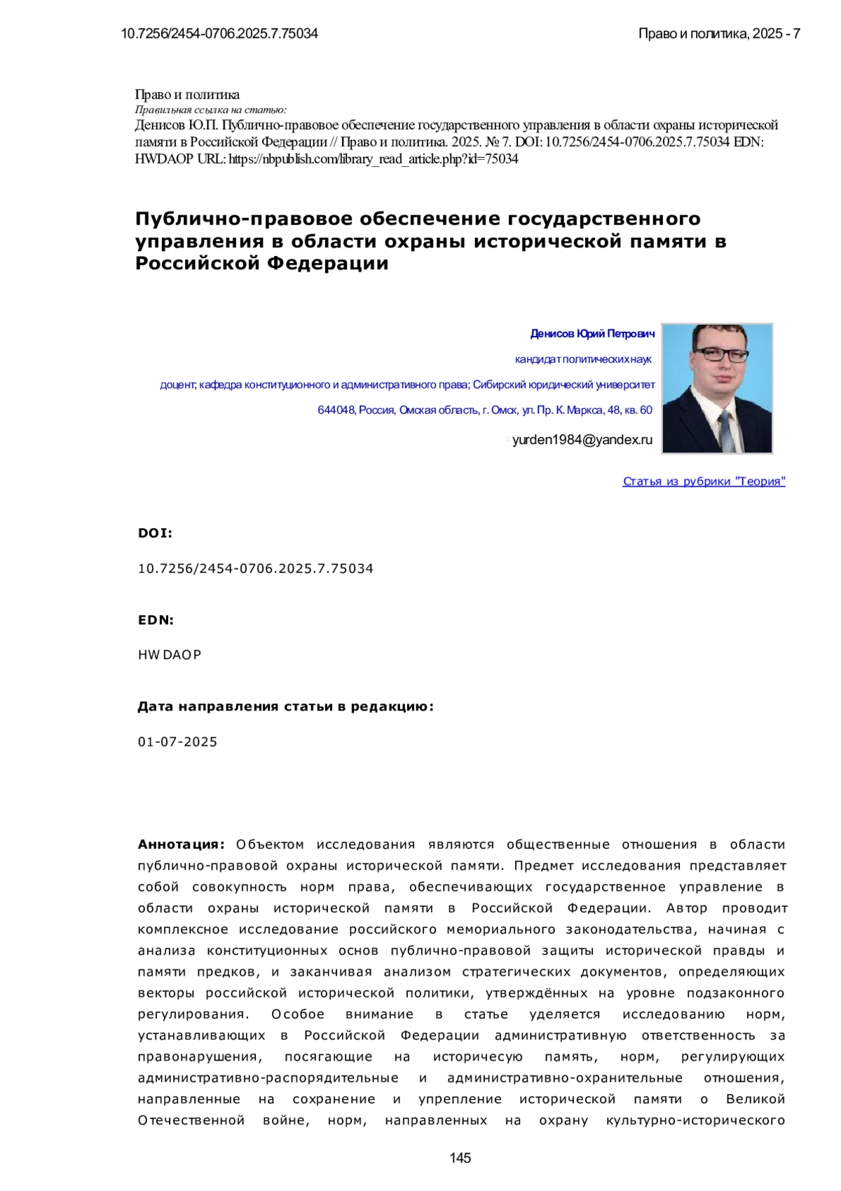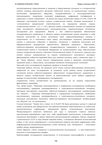 10. Денисов Ю.П. Административная ответственность за правонарушения в области охраны исторической памяти в Российской Федерации и Республике Беларусь // Юридические исследования. 2025. № 5. С. 50-63. URL: https://nbpublish.com/library_read_article.php?id=74393. DOI: 10.25136/2409-7136.2025.5.74393