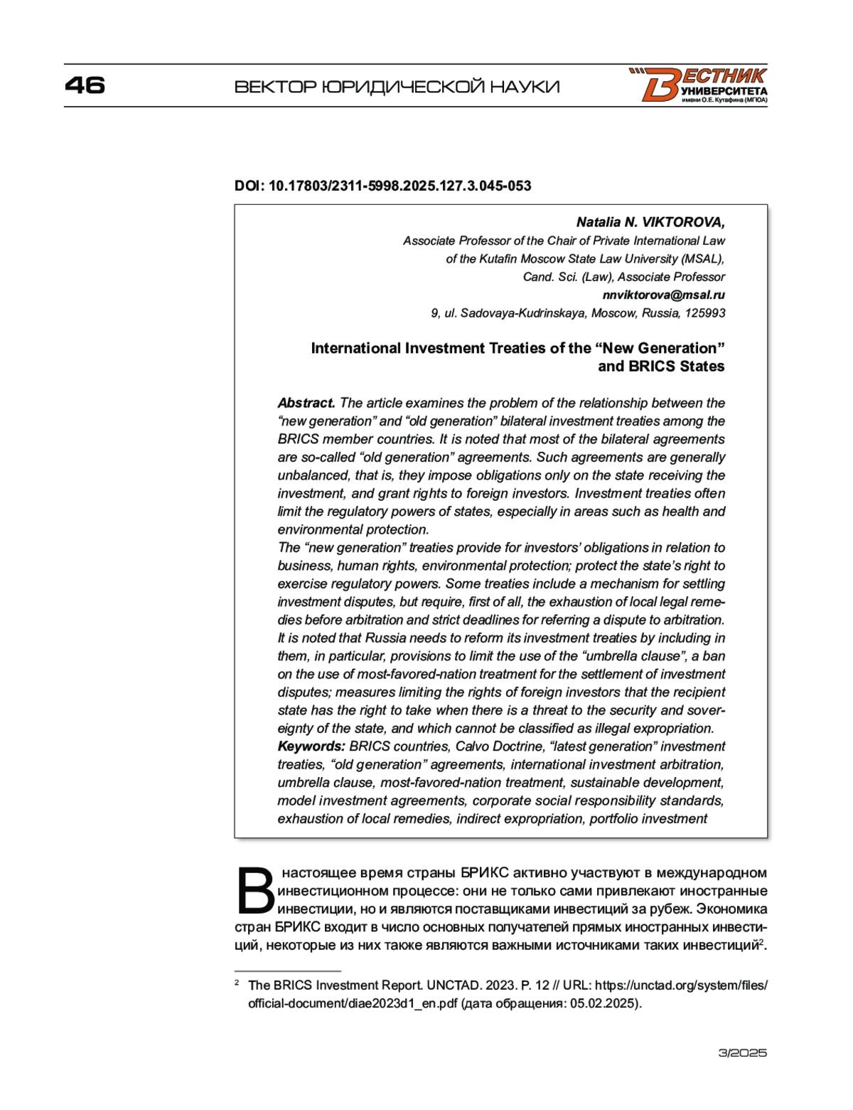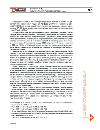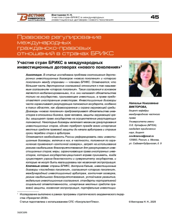 В статье исследована проблема соотношения двусторонних инвестиционных договоров «нового поколения» и «старого поколения» между странами — членами БРИКС. Отмечается, что бо́льшая часть двусторонних соглашений относится к так называемым соглашениям «старого поколения». Такие соглашения в основном являются несбалансированными, т. е. они налагают обязательства только на государство, принимающее инвестиции, а права предоставляют иностранным инвесторам. Инвестиционные договоры часто ограничивают регулирующие полномочия государств, особенно в таких областях, как здравоохранение и охрана окружающей среды. Договоры «нового поколения» предусматривают обязательства инвесторов в отношении бизнеса, прав человека, защиты окружающей среды; защищают право государства на осуществление регулирующих полномочий. Некоторые договоры включает механизм урегулирования инвестиционных споров, однако требуют прежде всего исчерпание местных средств правовой защиты до начала арбитража и строгие сроки передачи спора в арбитраж.