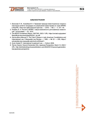 1. Беликова К. М., Ахмадова М. А. Правовая природа инвестиционных споров и некоторые аспекты процедуры их разрешения инвесторами их стран БРИКС в МЦУИС // Вестник арбитражной практики. - 2018. - № 2. - С. 67-78.