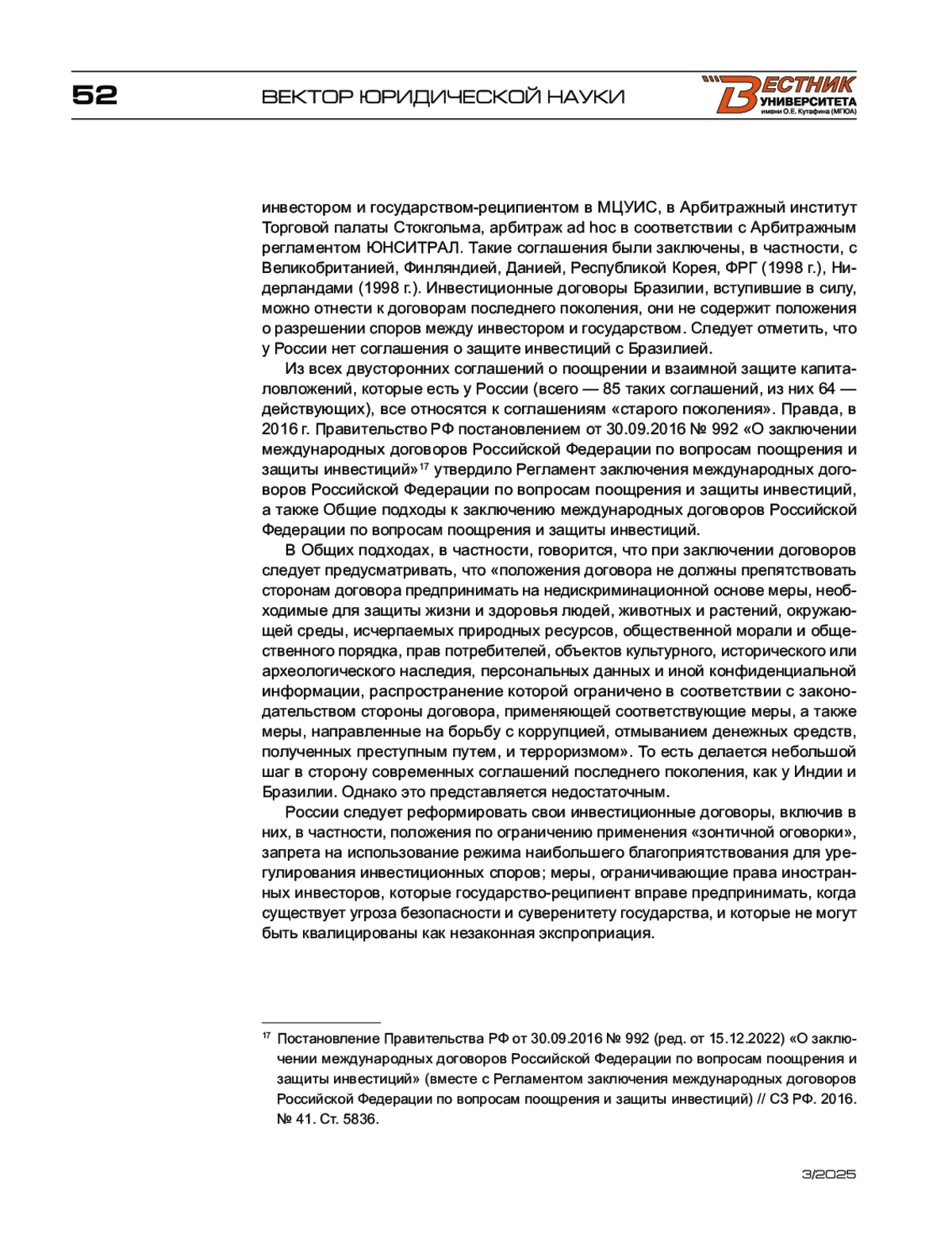 Отмечается необходимость России реформировать свои инвестиционные договоры, включив в них, в частности, положения по ограничению применения «зонтичной оговорки», запрет на использование режима наибольшего благоприятствования для урегулирования инвестиционных споров; меры, ограничивающие права иностранных инвесторов, которые государство-реципиент вправе принимать, когда существует угроза безопасности и суверенитету государства, и которые не могут быть квалицированы как незаконная экспроприация.
