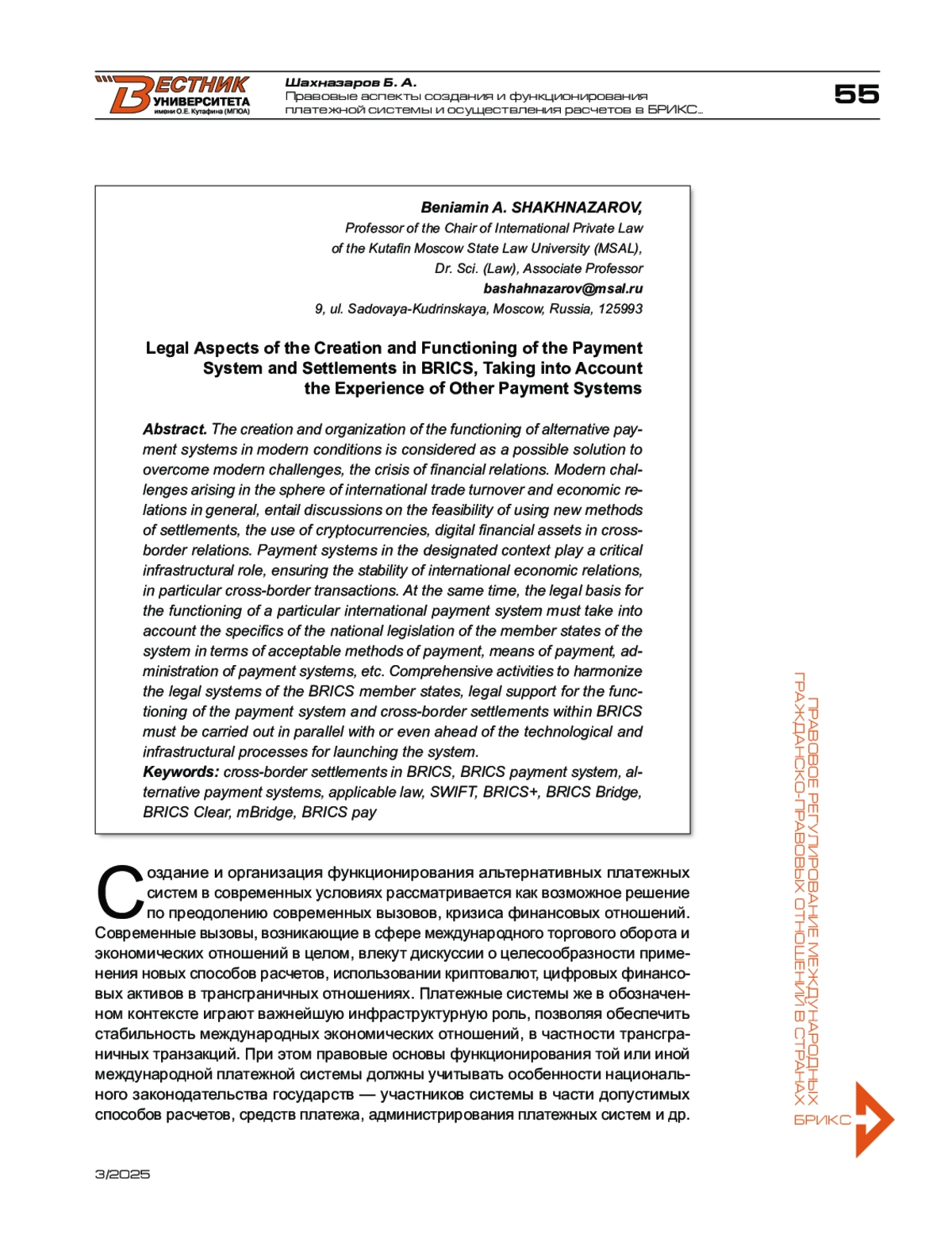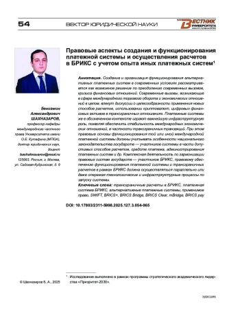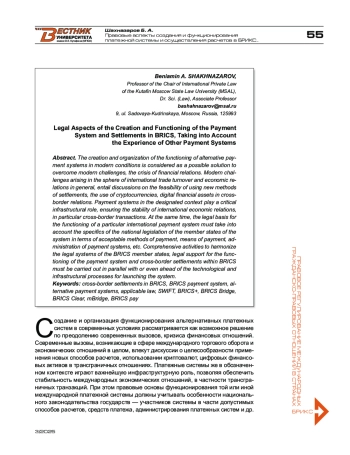 Создание и организация функционирования альтернативных платежных систем в современных условиях рассматривается как возможное решение по преодолению современных вызовов, кризиса финансовых отношений. Современные вызовы, возникающие в сфере международного торгового оборота и экономических отношений в целом, влекут дискуссии о целесообразности применения новых способов расчетов, использовании криптовалют, цифровых финансовых активов в трансграничных отношениях. Платежные системы же в обозначенном контексте играют важнейшую инфраструктурную роль, позволяя обеспечить стабильность международных экономических отношений, в частности трансграничных транзакций. При этом правовые основы функционирования той или иной международной платежной системы должны учитывать особенности национального законодательства государств — участников системы в части допустимых способов расчетов, средств платежа, администрирования платежных систем и др. Комплексная деятельность по гармонизации правовых систем государств — участников БРИКС, правовому обеспечению функционирования платежной системы и трансграничных расчетов в рамках БРИКС должна осуществляться параллельно или даже опережая технологические и инфраструктурные процессы по запуску системы.