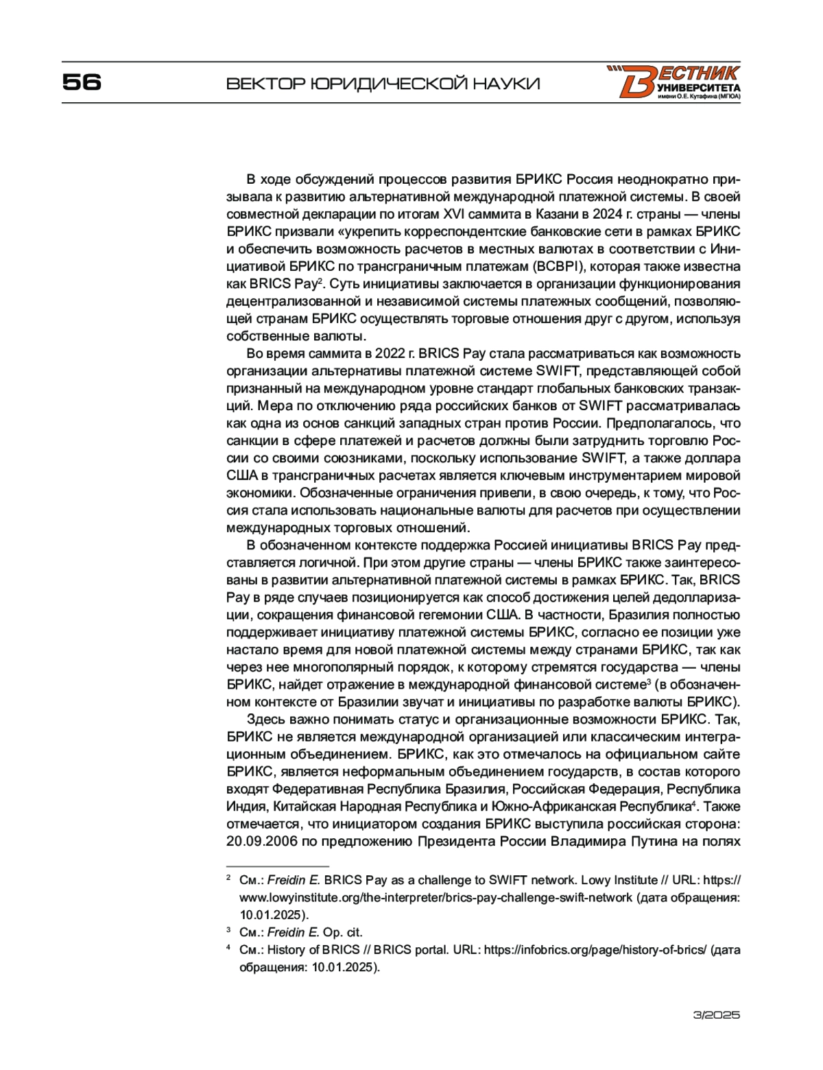 3. Freidin E. BRICS Pay as a challenge to SWIFT network. Lowy Institute // URL: https://www.lowyinstitute.org/the-interpreter/brics-pay-challenge-swift-network (дата обращения: 10.01.2025).