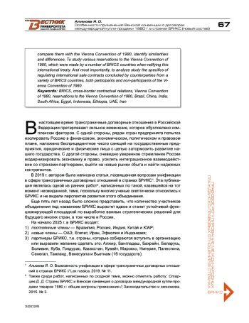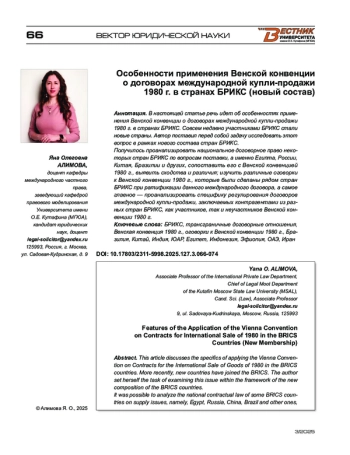 В настоящей статье речь идет об особенностях применения Венской конвенции о договорах международной купли-продажи 1980 г. в странах БРИКС. Совсем недавно участниками БРИКС стали новые страны. Автор поставил перед собой задачу исследовать этот вопрос в рамках нового состава стран БРИКС.