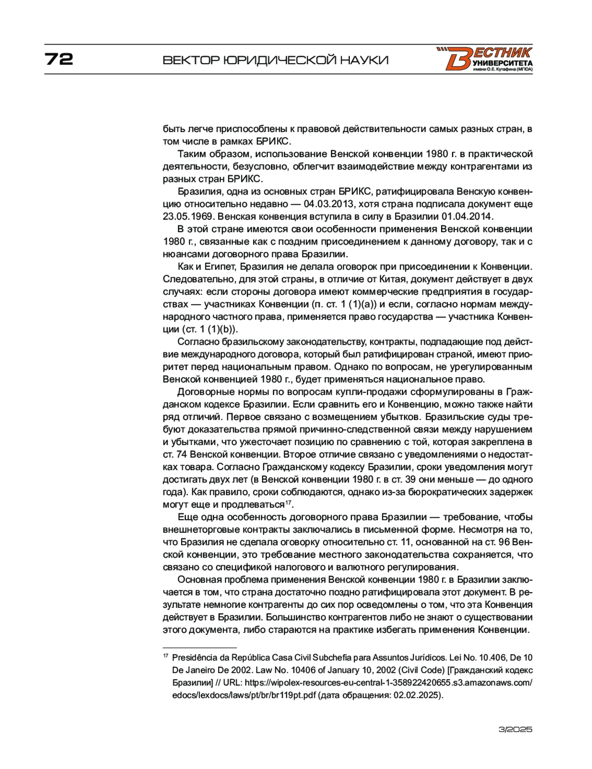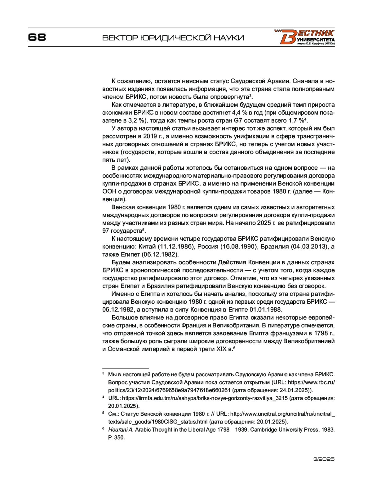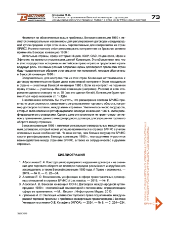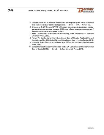 6. Старцева Д. Д. Страны БРИКС и Венская конвенция о договорах международной купли-продажи товаров 1980 года: общие вопросы применения // Законодательство и экономика. - № 3.