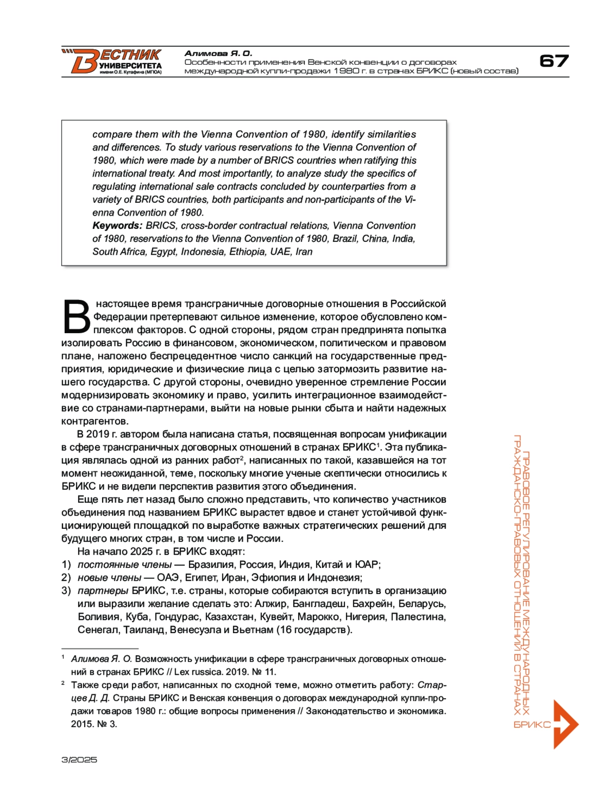 2. Алимова Я. О. Возможность унификации в сфере трансграничных договорных отношений в странах БРИКС // Lex russica. - 2019. - № 11.
