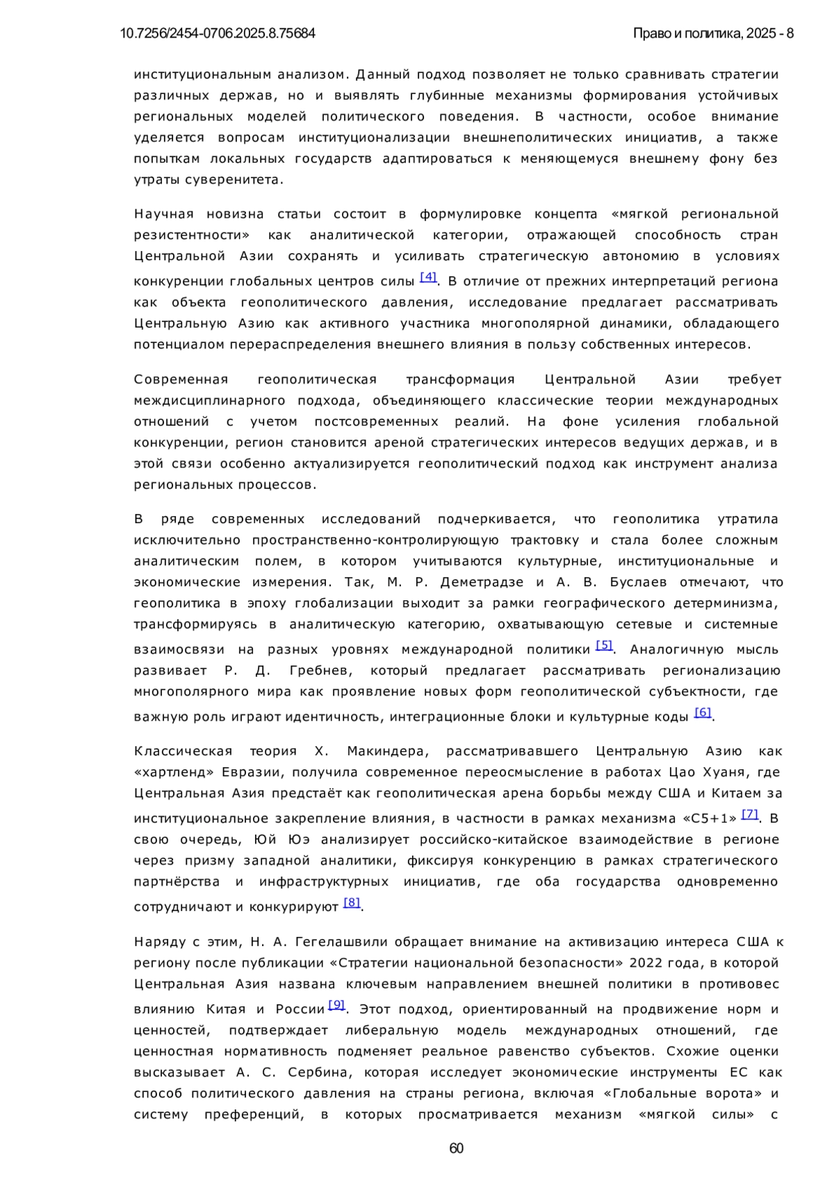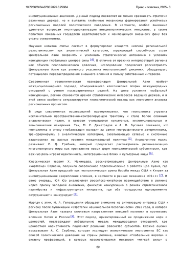 7. Цао Х. Анализ стратегий Китая и США в Центральной Азии: взгляд на механизм “С5+1” // Право и политика. 2024. № 10. С. 22-39. URL: https://nbpublish.com/library_read_article.php?id=71959. DOI: 10.7256/2454-0706.2024.10.71959