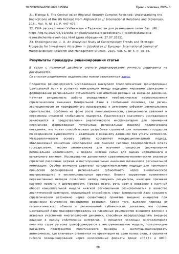 12. Дуйсен Г., Айтжанова Д. Оценка основных факторов развития Центральной Азии в условиях углубления сотрудничества и преодоления вызовов // Известия. Серия: Международные отношения и регионоведение. 2024. Т. 56, № 2. 10.48371/ISMO.2024.56.2.016 (дата обращения: 27.07.2025). DOI: 10.48371/ISMO.2024.56.2.016(