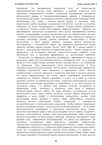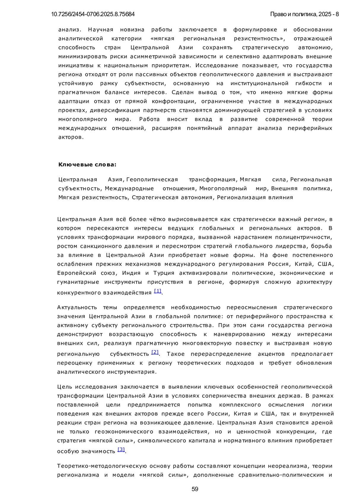 Предметом настоящего исследования является геополитическая трансформация Центральной Азии в условиях нарастающей конкуренции между глобальными и региональными акторами за влияние в стратегически важном евразийском пространстве. Объектом анализа выступают стратегии внешнеполитического поведения России, Китая, США, Европейского союза, Турции, Индии и Ирана, а также ответные реакции государств Центральной Азии на усиливающееся внешнее давление и меняющиеся условия международной среды. Автор подробно рассматривает институциональные, экономические и нормативные механизмы влияния со стороны указанных держав, а также формы адаптации и политического маневрирования со стороны Казахстана, Узбекистана, Таджикистана и других стран региона. Особое внимание уделяется формированию новой модели региональной субъектности, проявляющейся в виде стратегической многовекторности, выборочной интеграции, отказа от жесткой зависимости и политико-институционального прагматизма. Методологическая база включает элементы неореализма, теории регионализма, концепции «мягкой силы», а также сравнительно-политический и институциональный анализ. Научная новизна работы заключается в формулировке и обосновании аналитической категории «мягкая региональная резистентность», отражающей способность стран Центральной Азии сохранять стратегическую автономию, минимизировать риски асимметричной зависимости и селективно адаптировать внешние инициативы к национальным приоритетам. Исследование показывает, что государства региона отходят от роли пассивных объектов геополитического давления и выстраивают устойчивую рамку субъектности, основанную на институциональной гибкости и прагматичном балансе интересов. Сделан вывод о том, что именно мягкие формы адаптации отказ от прямой конфронтации, ограниченное участие в международных проектах, диверсификация партнерств становятся доминирующей стратегией в условиях многополярного мира. Работа вносит вклад в развитие современной теории международных отношений, расширяя понятийный аппарат анализа периферийных акторов.