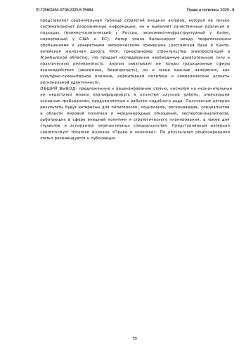 8. Юй Юэ. Взаимодействие России и Китая в Центральной Азии на фоне меняющегося международного порядка: западный взгляд // Общество: политика, экономика, право. 2024. № 11. С. 94-101. DOI: 10.24158/pep.2024.11.12