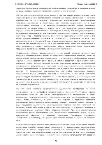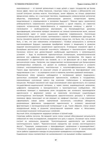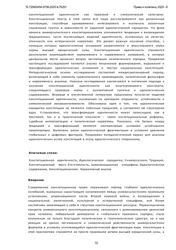 Современные конституции всё чаще становятся не только правовыми актами, но и носителями идеологического послания, отражающего особенности культурной, исторической и цивилизационной идентичности конкретного общества. Противостояние универсалистских ценностей либеральной демократии и стремления государств к утверждению уникального культурного кода актуализирует изучение конституционной идентичности как правовой и символической категории. Конституционные тексты в этой связи всё чаще рассматриваются как динамичные конструкции, способные одновременно интегрировать и исключать различные социальные группы в зависимости от заданной идеологической парадигмы. На фоне кризиса универсалистского конституционализма усиливаются тенденции к возрождению традиционных, часто исключающих моделей идентичности, основанных на религии, этничности или историческом нарративе. Это делает важным изучение способов, с помощью которых идеологические основания закрепляются и транслируются через нормы высшей юридической силы. Конституционная идентичность становится результатом взаимодействия нормативного и нарративного измерений, в которых центральное место занимает вопрос легитимации политического порядка. Предметом настоящего исследования является анализ механизмов формирования, выражения и трансформации идеологических оснований в текстах национальных конституций. Методологическую основу исследования составляют междисциплинарный подход, включающий в себя элементы сравнительного правоведения, политической философии и нарративного анализа. Новизна исследования заключается в системном подходе к изучению конституционной идентичности как многоуровневого конструкта, соединяющего правовую норму с коллективной памятью и идеологическим содержанием. Впервые в отечественной литературе предложена типология моделей конституционной идентичности, основанная на критериях открытости, устойчивости и символической репрезентативности. Обоснована идея о том, что идеологическая парадигма конституции не является побочным продуктом, а составляет её структурное ядро. Установлено, что трансформация идентичности может происходить как в текстовой, так и в практической плоскости - через институциональные реформы, судебную интерпретацию и политические нарративы. Показано, что баланс между традицией и трансформацией является неотъемлемым условием устойчивости правопорядка. Выявлены риски идеологической фрагментации в условиях давления глобальных и цифровых факторов. Предложен методологический каркас для анализа идеологических основ конституций в эпоху идеологического плюрализма.
