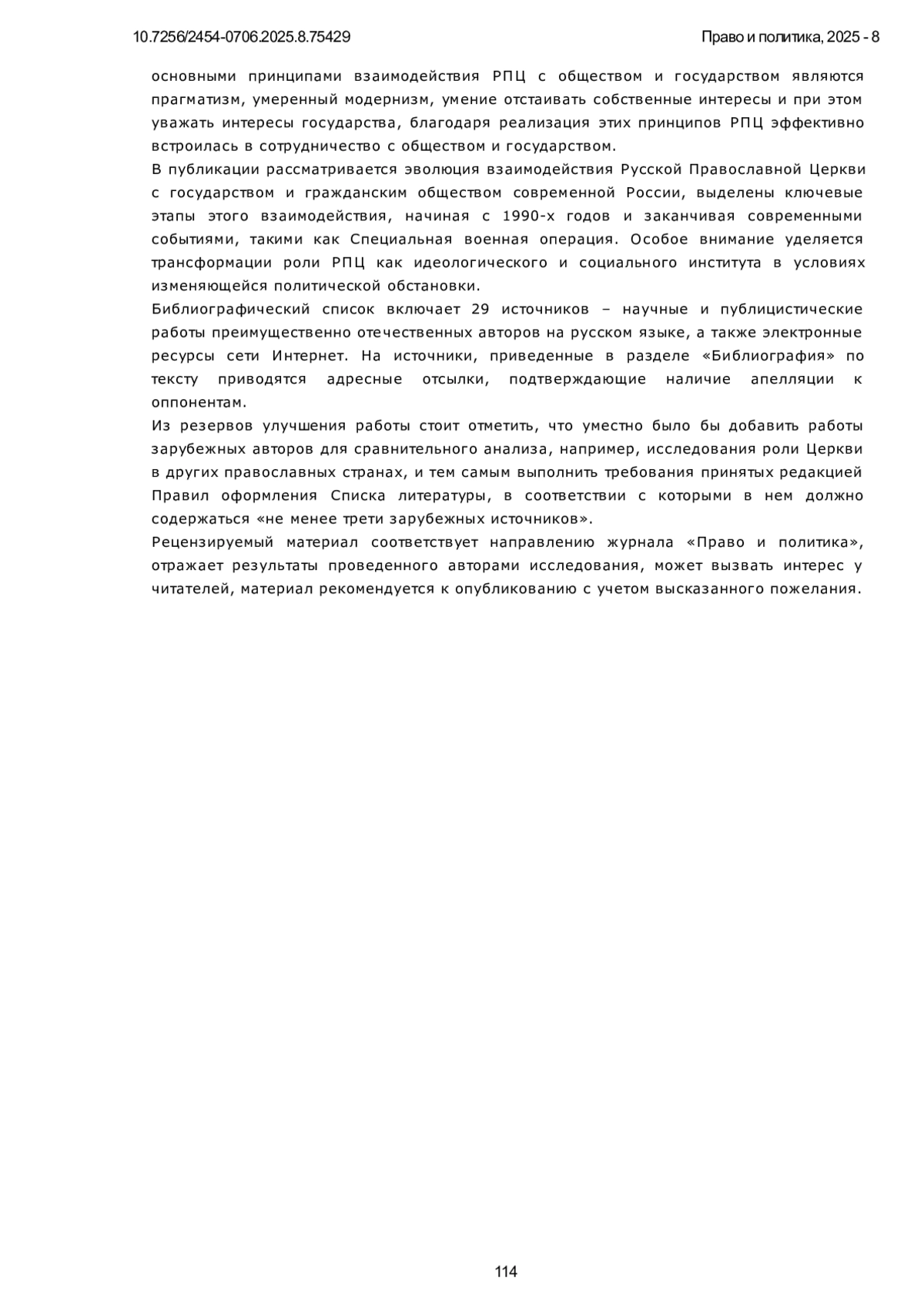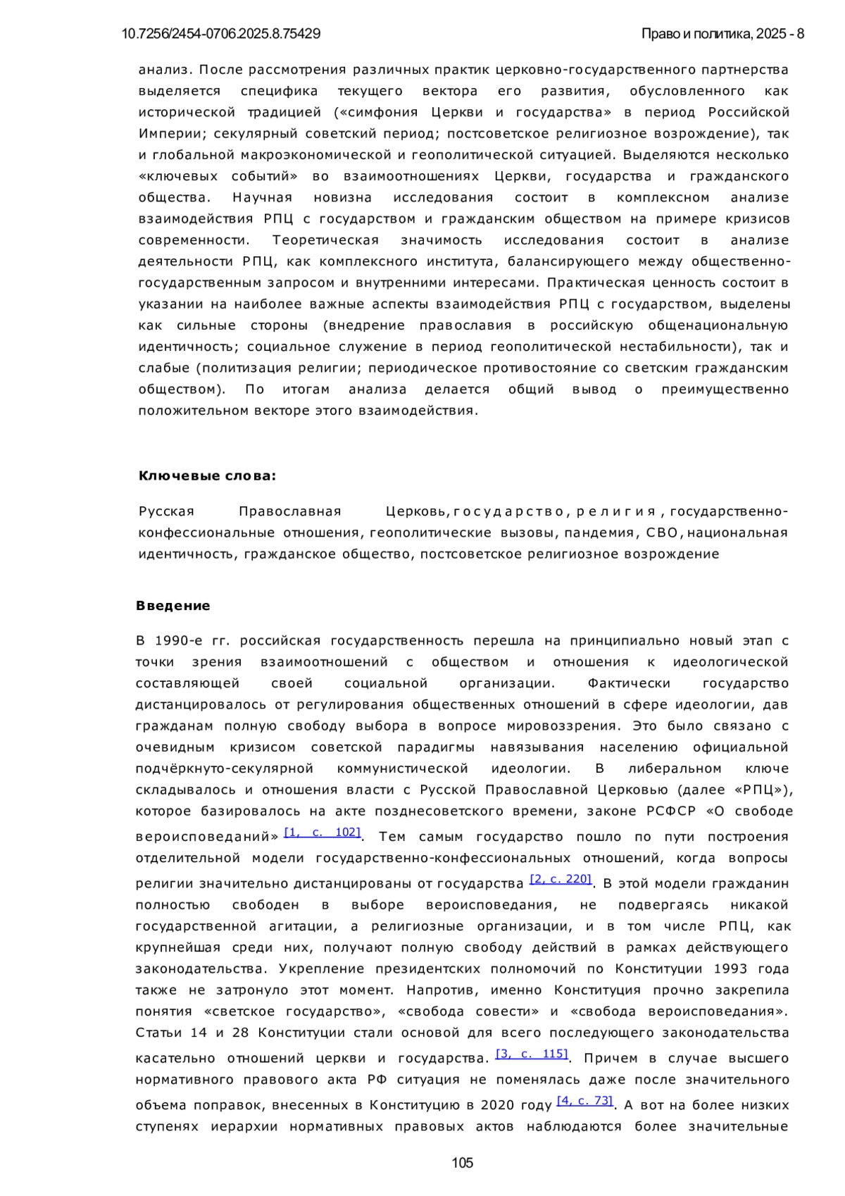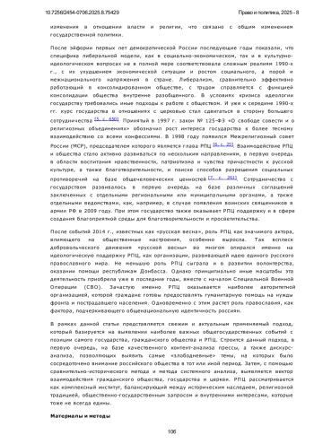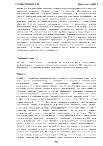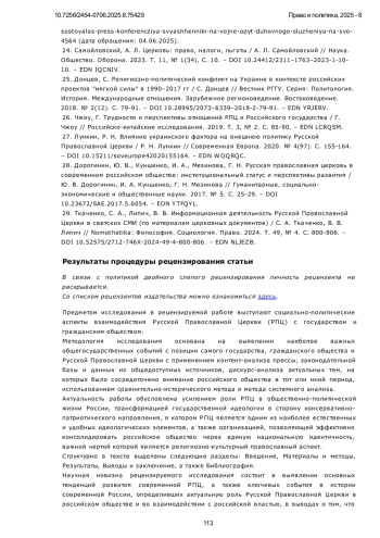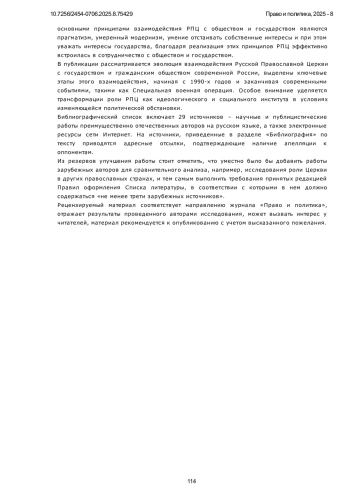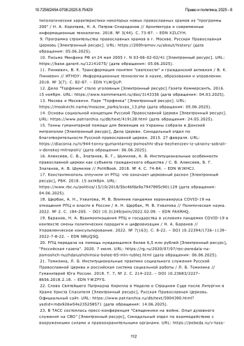 7. Карев, Д. А. Особенности взаимодействия государства и РПЦ в современном российском обществе / Д. А. Карев // Теория и практика общественного развития. 2023. № 7(183). С. 258-264. DOI: 10.24158/tipor.2023.7.36