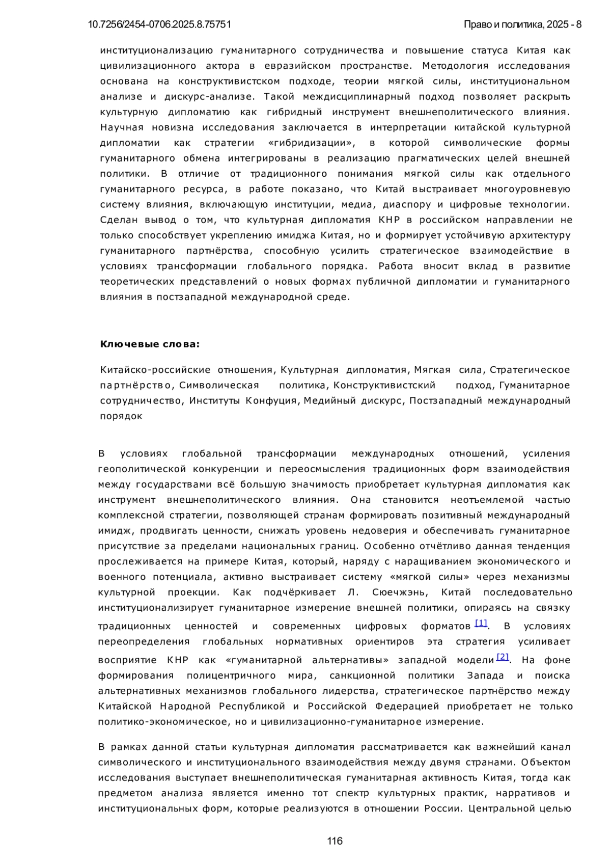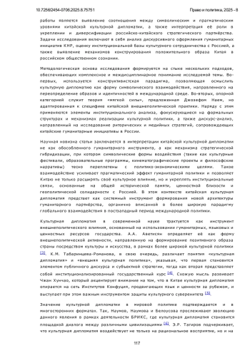 Предметом исследования является культурная дипломатия Китайской Народной Республики в контексте её стратегического партнёрства с Российской Федерацией в условиях трансформации глобального порядка и усиления геополитической конкуренции. Объектом анализа выступают символические практики, институциональные механизмы, медиаплатформы, цифровые ресурсы и образовательные инициативы, через которые Китай реализует гуманитарную активность и продвигает свою культурную идентичность на российском направлении. Автор подробно рассматривает, как элементы мягкой силы от Институтов Конфуция и культурных фестивалей до академических обменов, цифровых медиастратегий и деятельности китайской диаспоры формируют позитивный и устойчивый образ КНР в российском общественном и экспертном сознании. Особое внимание уделяется балансу между идеологическим символизмом и прагматическими целями, включая укрепление стратегического доверия, продвижение политико-экономических интересов, институционализацию гуманитарного сотрудничества и повышение статуса Китая как цивилизационного актора в евразийском пространстве. Методология исследования основана на конструктивистском подходе, теории мягкой силы, институциональном анализе и дискурс-анализе. Такой междисциплинарный подход позволяет раскрыть культурную дипломатию как гибридный инструмент внешнеполитического влияния. Научная новизна исследования заключается в интерпретации китайской культурной дипломатии как стратегии «гибридизации», в которой символические формы гуманитарного обмена интегрированы в реализацию прагматических целей внешней политики. В отличие от традиционного понимания мягкой силы как отдельного гуманитарного ресурса, в работе показано, что Китай выстраивает многоуровневую систему влияния, включающую институции, медиа, диаспору и цифровые технологии. Сделан вывод о том, что культурная дипломатия КНР в российском направлении не только способствует укреплению имиджа Китая, но и формирует устойчивую архитектуру гуманитарного партнёрства, способную усилить стратегическое взаимодействие в условиях трансформации глобального порядка. Работа вносит вклад в развитие теоретических представлений о новых формах публичной дипломатии и гуманитарного влияния в постзападной международной среде.