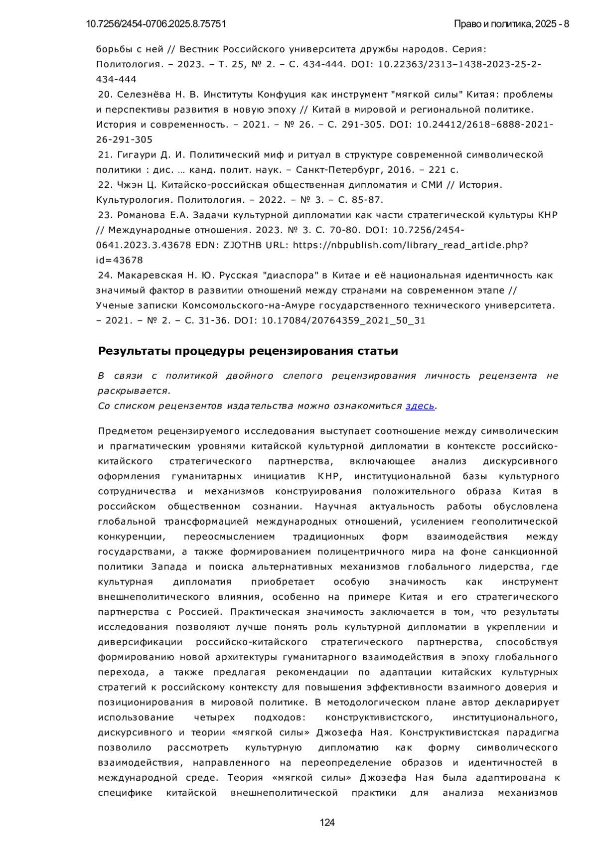 23. Романова Е.А. Задачи культурной дипломатии как части стратегической культуры КНР // Международные отношения. 2023. № 3. С. 70-80. URL: https://nbpublish.com/library_read_article.php?id=43678. DOI: 10.7256/2454-0641.2023.3.43678