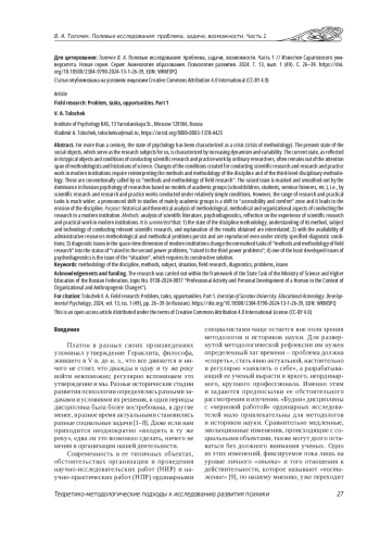 Более столетия состояние психологии характеризуется как кризис (кризис методологии). Настоящее состояние социальных объектов, выступающих для нас предметами исследования, характеризуется возрастающей динамичностью, изменчивостью. Современность в ее типичных объектах, обстоятельствах проведения научно-исследовательских работ (НИР) и научно-практический работ (НПР) ординарными исследователями чаще остается вне поля внимания методологов и историков науки. Изменение условий проведения НИР и НПР в современных организациях требует переосмысления методов и методологии дисциплины, третьего уровня дисциплинарной методологии, условно названых нами «методы и методология полевых исследований». Названная проблема еще маскируется и сглаживается доминированием в отечественной психологии исследованиями на моделях учебных групп (школьников, студентов, слушателей семинаров и др.), т. е. НИР и НПР, проводимых в сравнительно несложных условиях. Но спектр научно-исследовательских и практических задач много шире; выраженное смещение в сторону обследования преимущественно учебных групп, в пространства «доступности и комфорта», ведет к эрозии дисциплины.