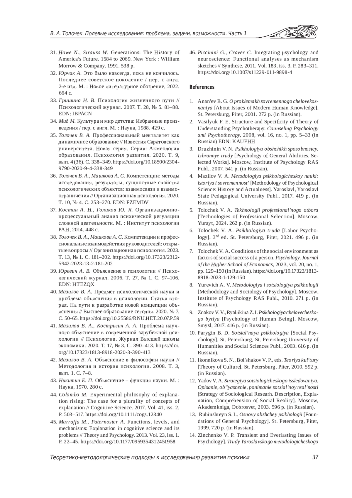 35. Толочек В. А. Профессиональный менталитет как динамичное образование // Известия Саратовского университета. Новая серия. Серия: Акмеология образования. Психология развития. 2020. Т. 9, вып. 4 (36). С. 338-349. DOI: 10.18500/2304-9790-2020-9-4-338-349 EDN: SZUNBQ
