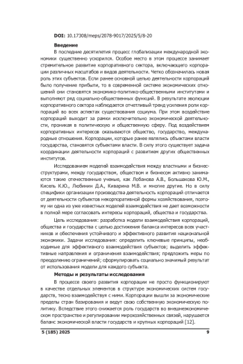 В триаде «общество – государство – корпорации» общество выполняет ключевую функцию, представляя собой сложную социальную систему, где основным элементом являются люди с их разнообразными связями и взаимодействием. Государство как важнейшая подсистема служит каналом организации и управления обществом. Оно осуществляет свои полномочия через различные правительственные структуры: законодательные, исполнительные и судебные органы власти. Корпорации как крупнейшие экономические единицы представляют собой подсистему, которая производит товары и услуги, необходимые для устойчивого развития общества и удовлетворения потребностей его членов, влияет на развитие всей экономической системы, государственную политику и общественное мнение [8].