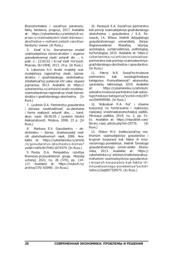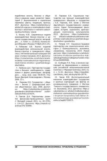 1. Большакова Ю.М. Социодинамика взаимодействия власти и бизнеса: анализ российских практик // Проблемный анализ и государственноуправленческое проектирование. Доступно: https://www.ogt-journal.com/jour/article/viewFile/94/93.