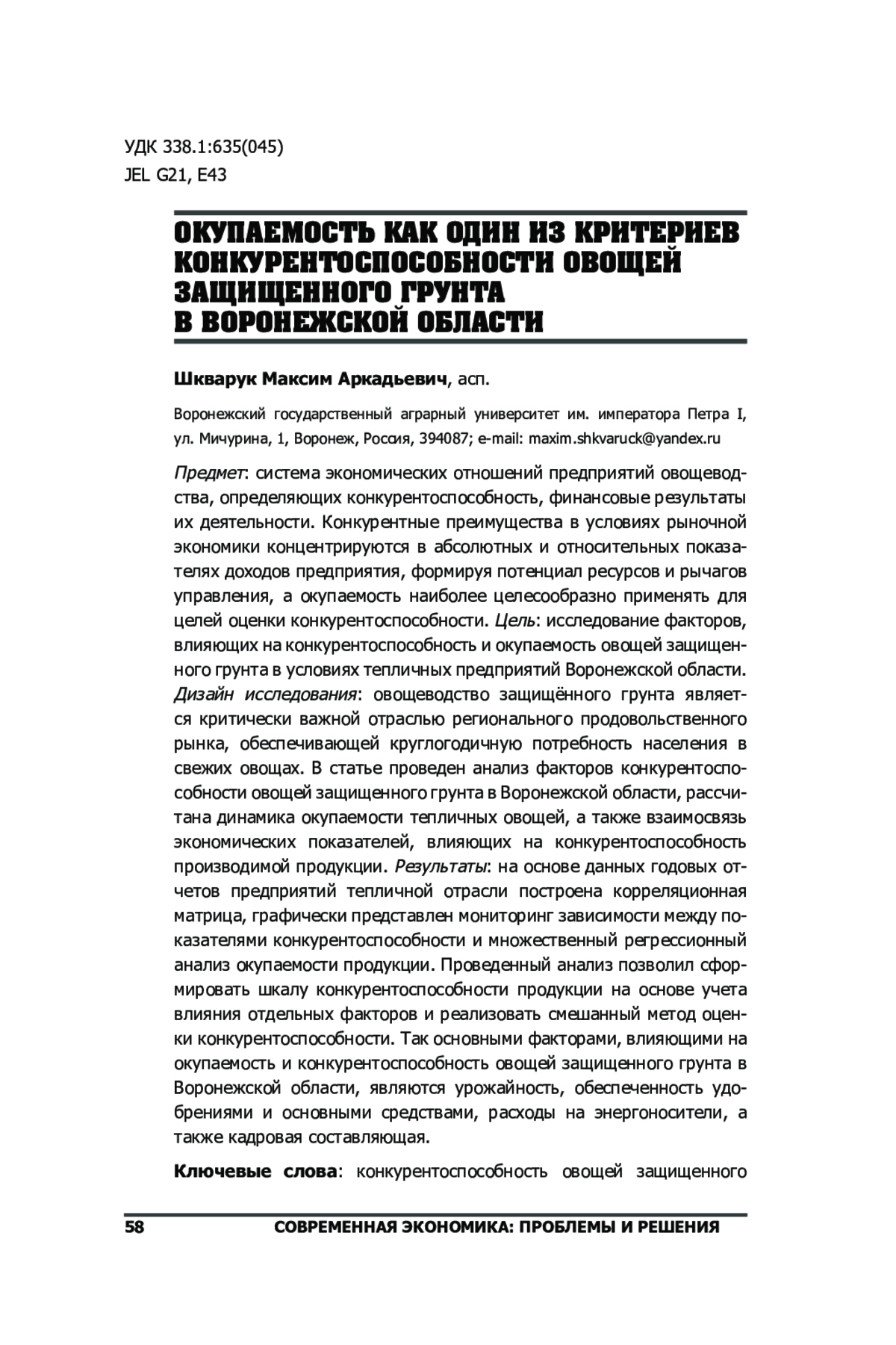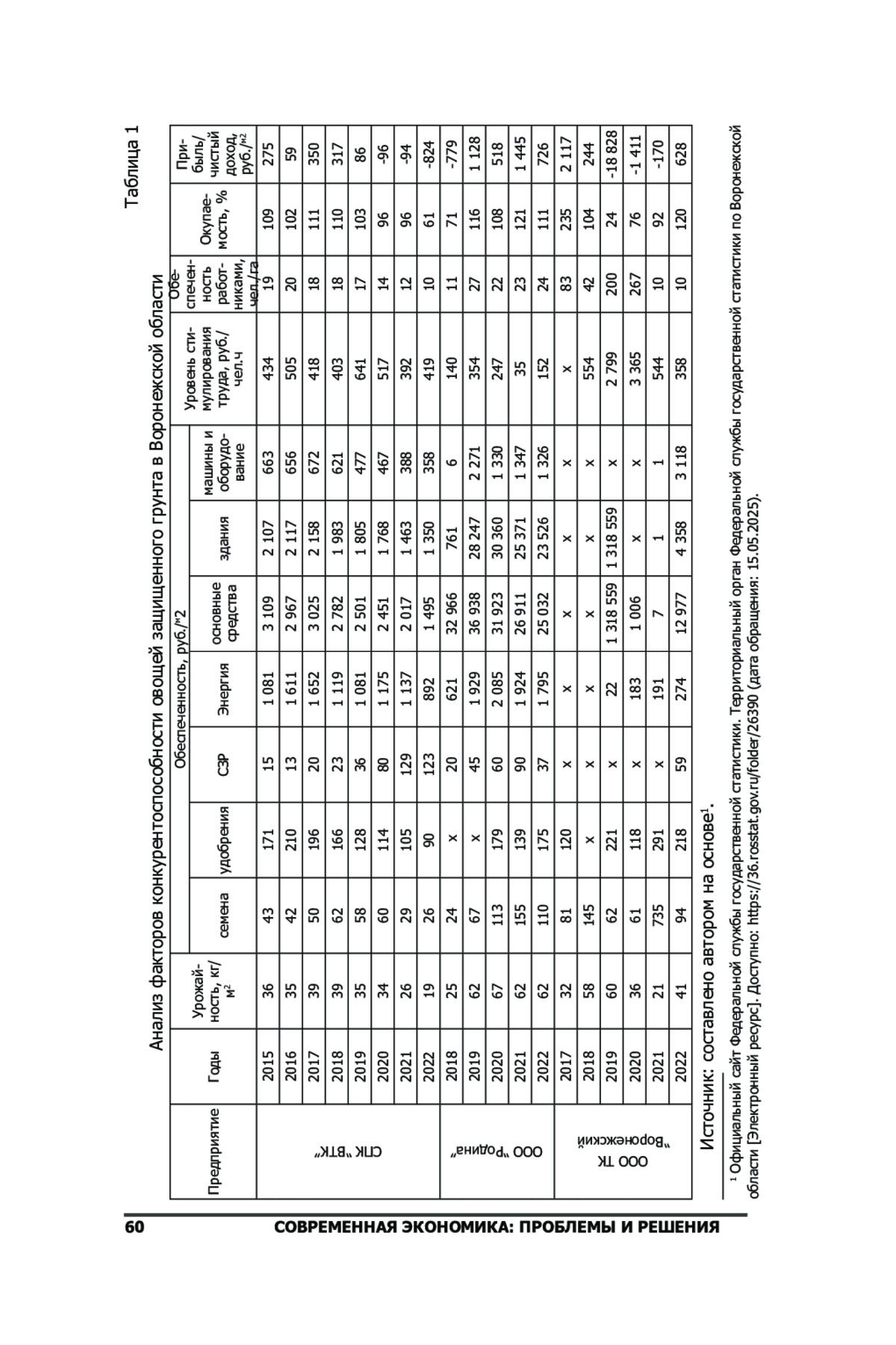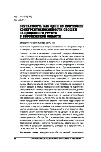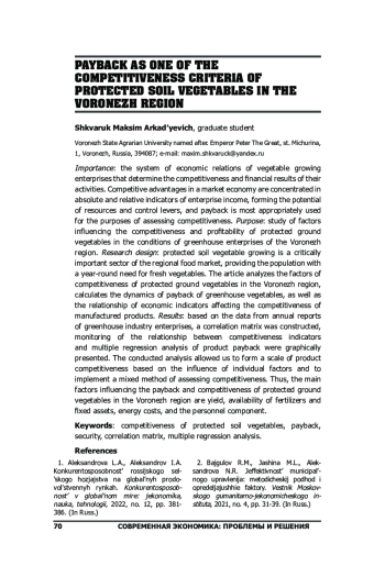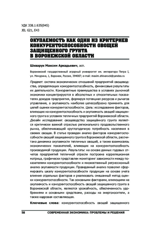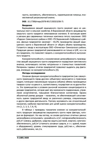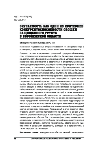 Предмет: система экономических отношений предприятий овощеводства, определяющих конкурентоспособность, финансовые результаты их деятельности. Конкурентные преимущества в условиях рыночной экономики концентрируются в абсолютных и относительных показателях доходов предприятия, формируя потенциал ресурсов и рычагов управления, а окупаемость наиболее целесообразно применять для целей оценки конкурентоспособности. Цель: исследование факторов, влияющих на конкурентоспособность и окупаемость овощей защищенного грунта в условиях тепличных предприятий Воронежской области. Дизайн исследования: овощеводство защищённого грунта является критически важной отраслью регионального продовольственного рынка, обеспечивающей круглогодичную потребность населения в свежих овощах. В статье проведен анализ факторов конкурентоспособности овощей защищенного грунта в Воронежской области, рассчитана динамика окупаемости тепличных овощей, а также взаимосвязь экономических показателей, влияющих на конкурентоспособность производимой продукции. Результаты: на основе данных годовых отчетов предприятий тепличной отрасли построена корреляционная матрица, графически представлен мониторинг зависимости между показателями конкурентоспособности и множественный регрессионный анализ окупаемости продукции. Проведенный анализ позволил сформировать шкалу конкурентоспособности продукции на основе учета влияния отдельных факторов и реализовать смешанный метод оценки конкурентоспособности. Так основными факторами, влияющими на окупаемость и конкурентоспособность овощей защищенного грунта в Воронежской области, являются урожайность, обеспеченность удобрениями и основными средствами, расходы на энергоносители, а также кадровая составляющая.