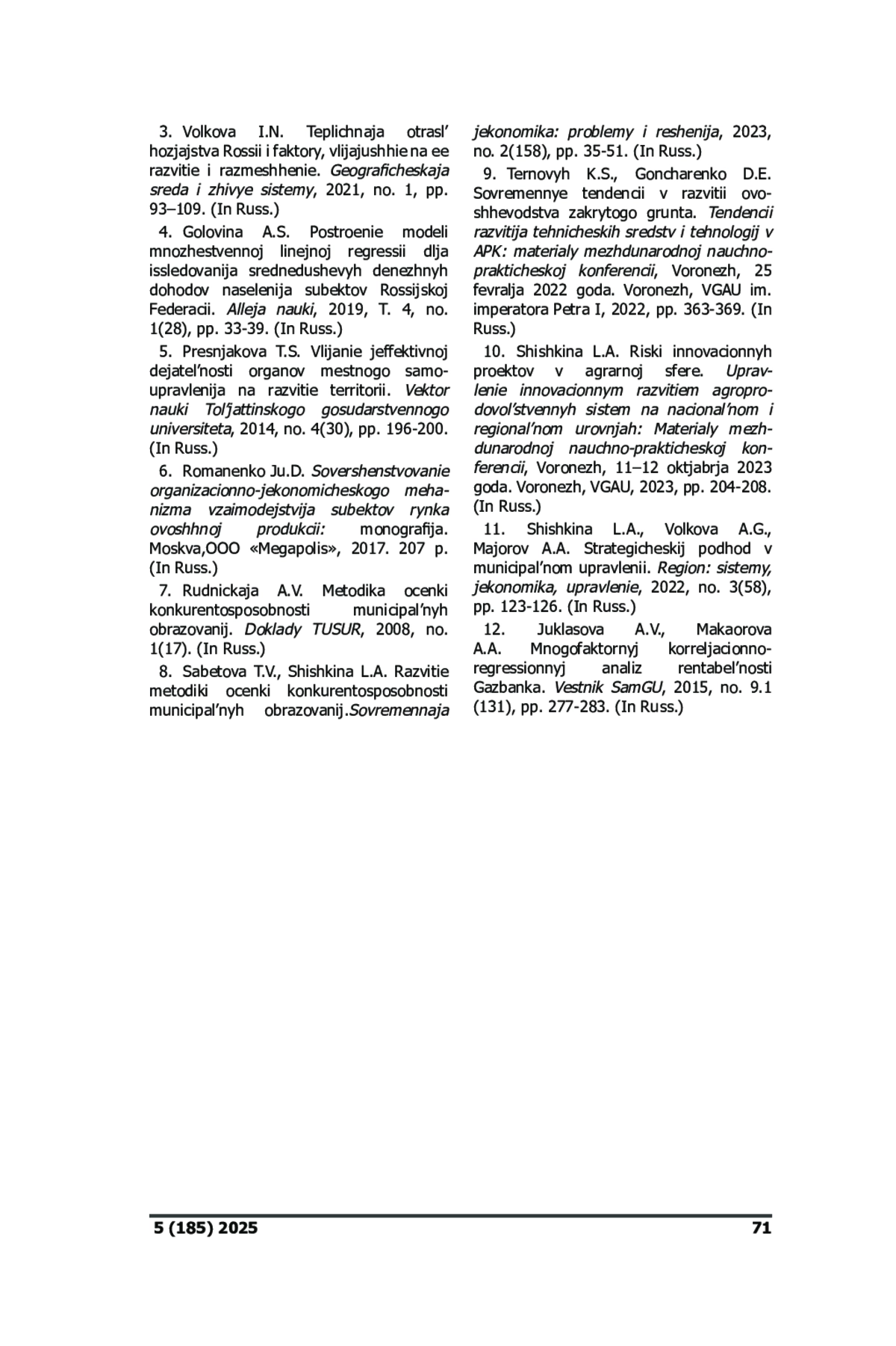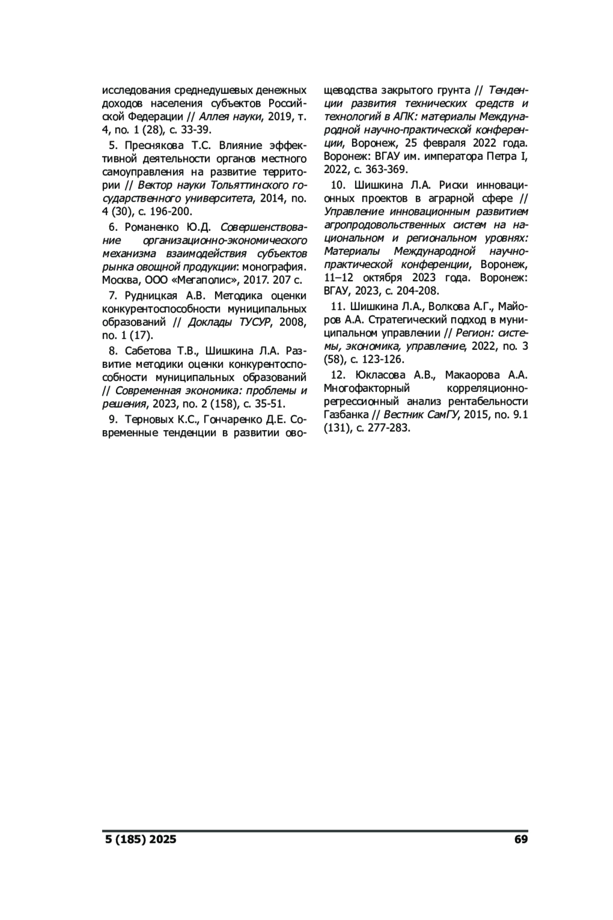 8. Сабетова Т.В., Шишкина Л.А. Развитие методики оценки конкурентоспособности муниципальных образований // Современная экономика: проблемы и решения, 2023, no. 2 (158), c. 35-51. EDN: KHLUNG