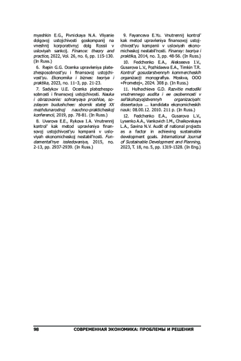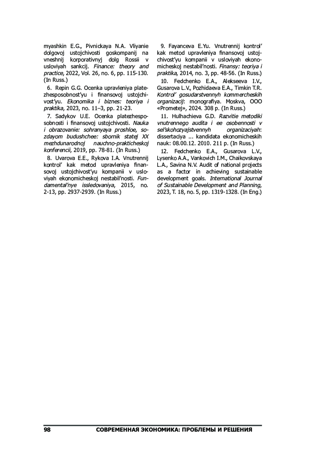 12. Fedchenko E.A., Gusarova L.V., Lysenko A.A., Vankovich I.M., Chaikovskaya L.A., Savina N.V. Audit of national projects as a factor in achieving sustainable development goals // International Journal of Sustainable Development and Planning, 2023, Т. 18, no. 5, рр. 1319-1328. EDN: FNQPHW