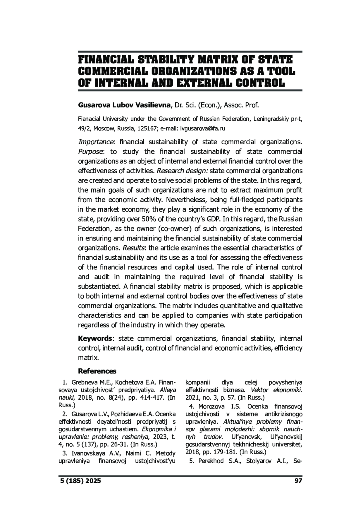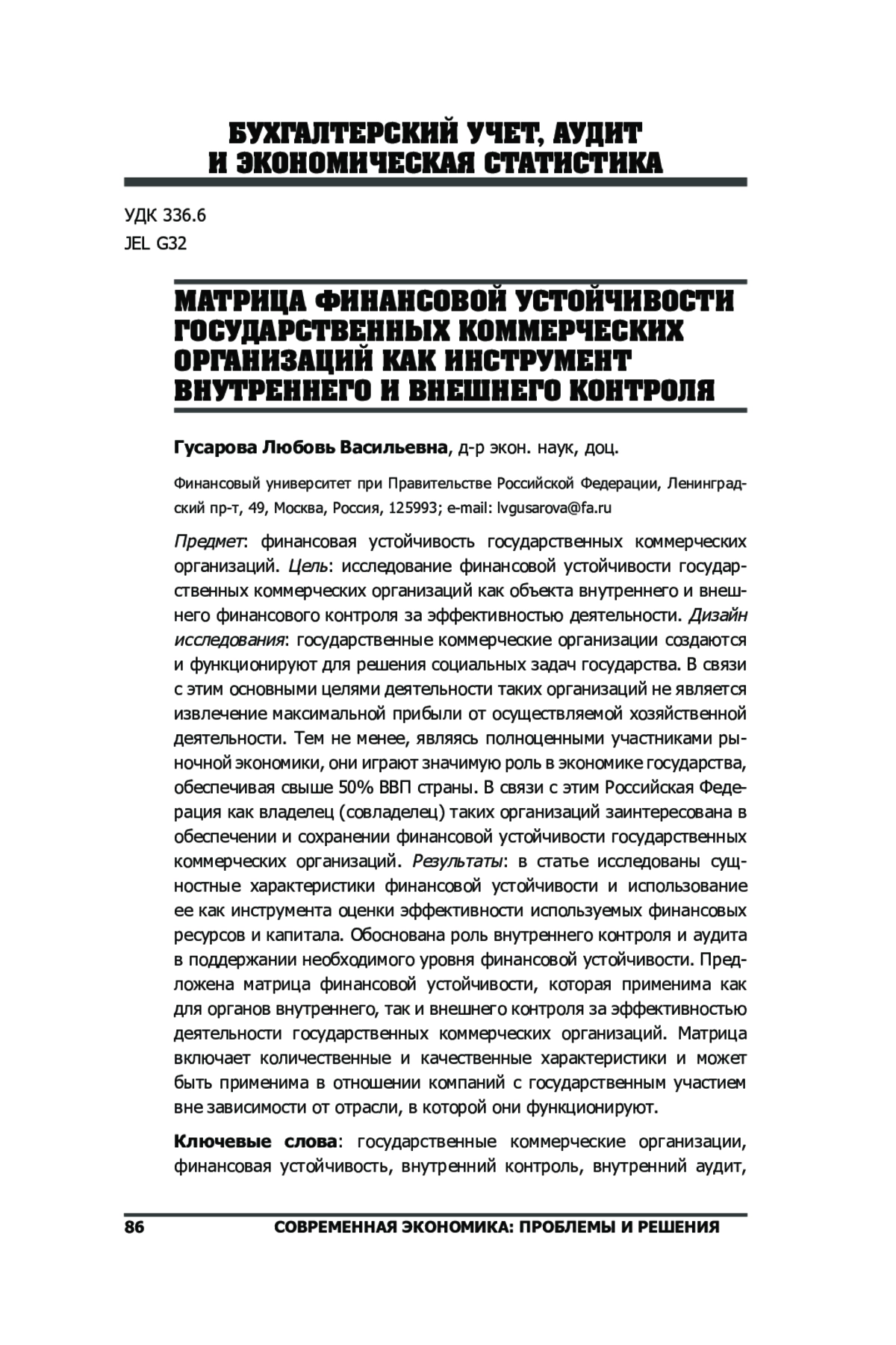 Предмет: финансовая устойчивость государственных коммерческих организаций. Цель: исследование финансовой устойчивости государственных коммерческих организаций как объекта внутреннего и внешнего финансового контроля за эффективностью деятельности. Дизайн исследования: государственные коммерческие организации создаются и функционируют для решения социальных задач государства. В связи с этим основными целями деятельности таких организаций не является извлечение максимальной прибыли от осуществляемой хозяйственной деятельности. Тем не менее, являясь полноценными участниками рыночной экономики, они играют значимую роль в экономике государства, обеспечивая свыше 50% ВВП страны. В связи с этим Российская Федерация как владелец (совладелец) таких организаций заинтересована в обеспечении и сохранении финансовой устойчивости государственных коммерческих организаций. Результаты: в статье исследованы сущностные характеристики финансовой устойчивости и использование ее как инструмента оценки эффективности используемых финансовых ресурсов и капитала. Обоснована роль внутреннего контроля и аудита в поддержании необходимого уровня финансовой устойчивости. Предложена матрица финансовой устойчивости, которая применима как для органов внутреннего, так и внешнего контроля за эффективностью деятельности государственных коммерческих организаций. Матрица включает количественные и качественные характеристики и может быть применима в отношении компаний с государственным участием вне зависимости от отрасли, в которой они функционируют.