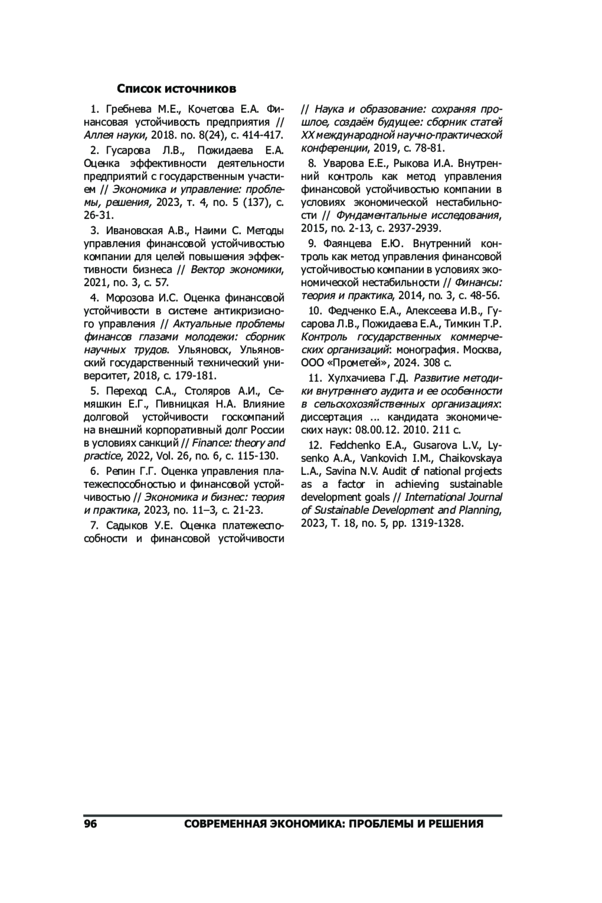 1. Гребнева М.Е., Кочетова Е.А. Финансовая устойчивость предприятия // Аллея науки, 2018. no. 8(24), с. 414-417. EDN: YLZGQX