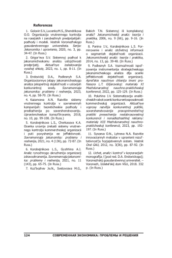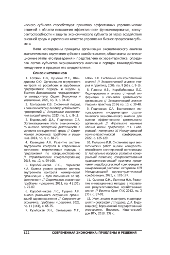 1. Головин С.В., Луценко М.С., Шендрикова О.О. Организация внутреннего контроля на российских и зарубежных предприятиях: подходы и модели // Вестник Воронежского государственного университета. Серия: Экономика и управление, 2020, no. 3, с. 34-47. EDN: MVPQCO