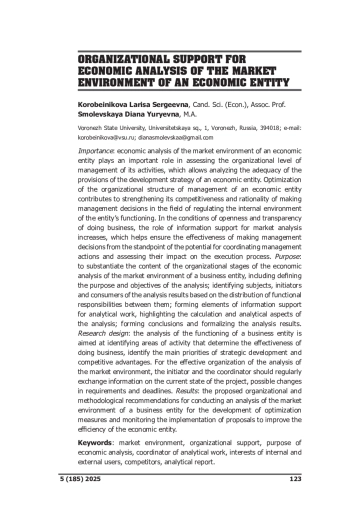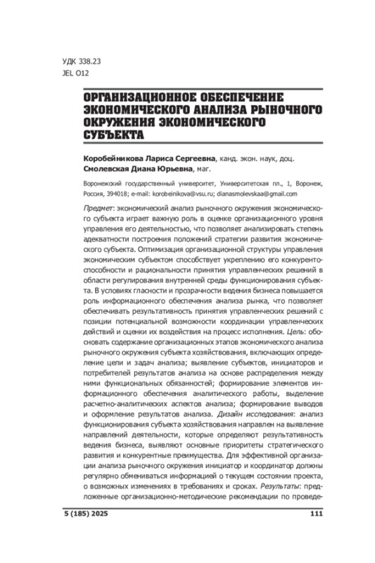 Предмет: экономический анализ рыночного окружения экономического субъекта играет важную роль в оценке организационного уровня управления его деятельностью, что позволяет анализировать степень адекватности построения положений стратегии развития экономического субъекта. Оптимизация организационной структуры управления экономическим субъектом способствует укреплению его конкурентоспособности и рациональности принятия управленческих решений в области регулирования внутренней среды функционирования субъекта. В условиях гласности и прозрачности ведения бизнеса повышается роль информационного обеспечения анализа рынка, что позволяет обеспечивать результативность принятия управленческих решений с позиции потенциальной возможности координации управленческих действий и оценки их воздействия на процесс исполнения. Цель: обосновать содержание организационных этапов экономического анализа рыночного окружения субъекта хозяйствования, включающих определение цели и задач анализа; выявление субъектов, инициаторов и потребителей результатов анализа на основе распределения между ними функциональных обязанностей; формирование элементов информационного обеспечения аналитического работы, выделение расчетно-аналитических аспектов анализа; формирование выводов и оформление результатов анализа. Дизайн исследования: анализ функционирования субъекта хозяйствования направлен на выявление направлений деятельности, которые определяют результативность ведения бизнеса, выявляют основные приоритеты стратегического развития и конкурентные преимущества. Для эффективной организации анализа рыночного окружения инициатор и координатор должны регулярно обмениваться информацией о текущем состоянии проекта, о возможных изменениях в требованиях и сроках. Результаты: предложенные организационно-методические рекомендации по проведению анализа рыночного окружения субъекта предпринимательской деятельности для разработки оптимизационных мероприятий и осуществления контроля внедрения предложений по повышению эффективности деятельности экономического субъекта.