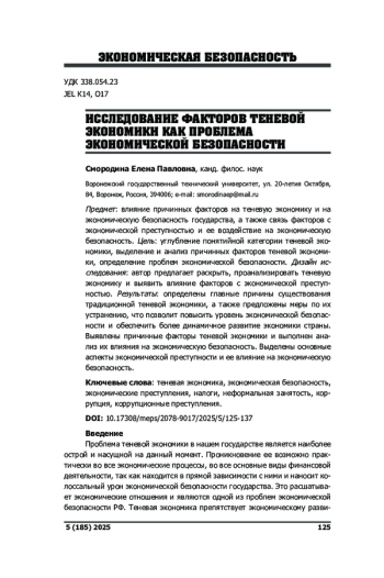 Предмет: влияние причинных факторов на теневую экономику и на экономическую безопасность государства, а также связь факторов с экономической преступностью и ее воздействие на экономическую безопасность. Цель: углубление понятийной категории теневой экономики, выделение и анализ причинных факторов теневой экономики, определение проблем экономической безопасности. Дизайн исследования: автор предлагает раскрыть, проанализировать теневую экономику и выявить влияние факторов с экономической преступностью. Результаты: определены главные причины существования традиционной теневой экономики, а также предложены меры по их устранению, что позволит повысить уровень экономической безопасности и обеспечить более динамичное развитие экономики страны. Выявлены причинные факторы теневой экономики и выполнен анализ их влияния на экономическую безопасность. Выделены основные аспекты экономической преступности и ее влияние на экономическую безопасность.