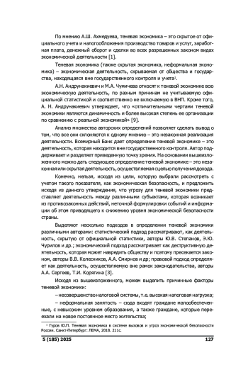 1. Ахмедуев А.Ш. Теневая экономика: системный ресурс и фактор торможения социально-экономического развития // Вопросы экономики, 2015, no. 9, с. 152160. EDN: UIKPLZ