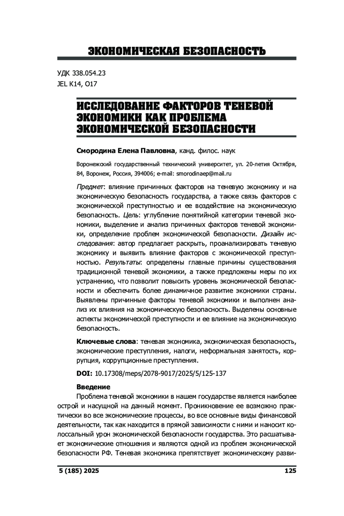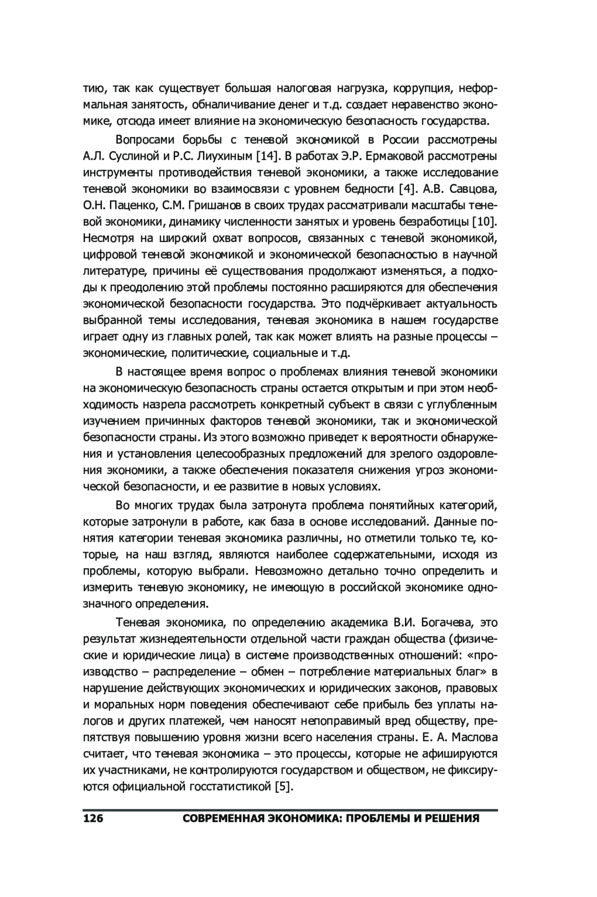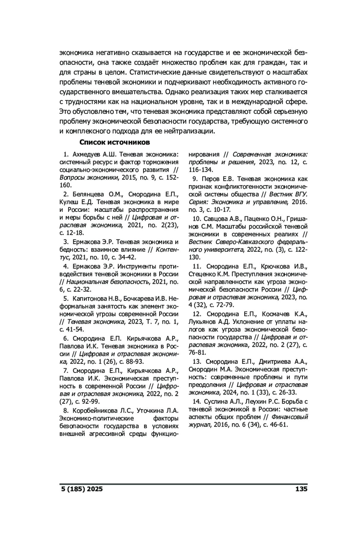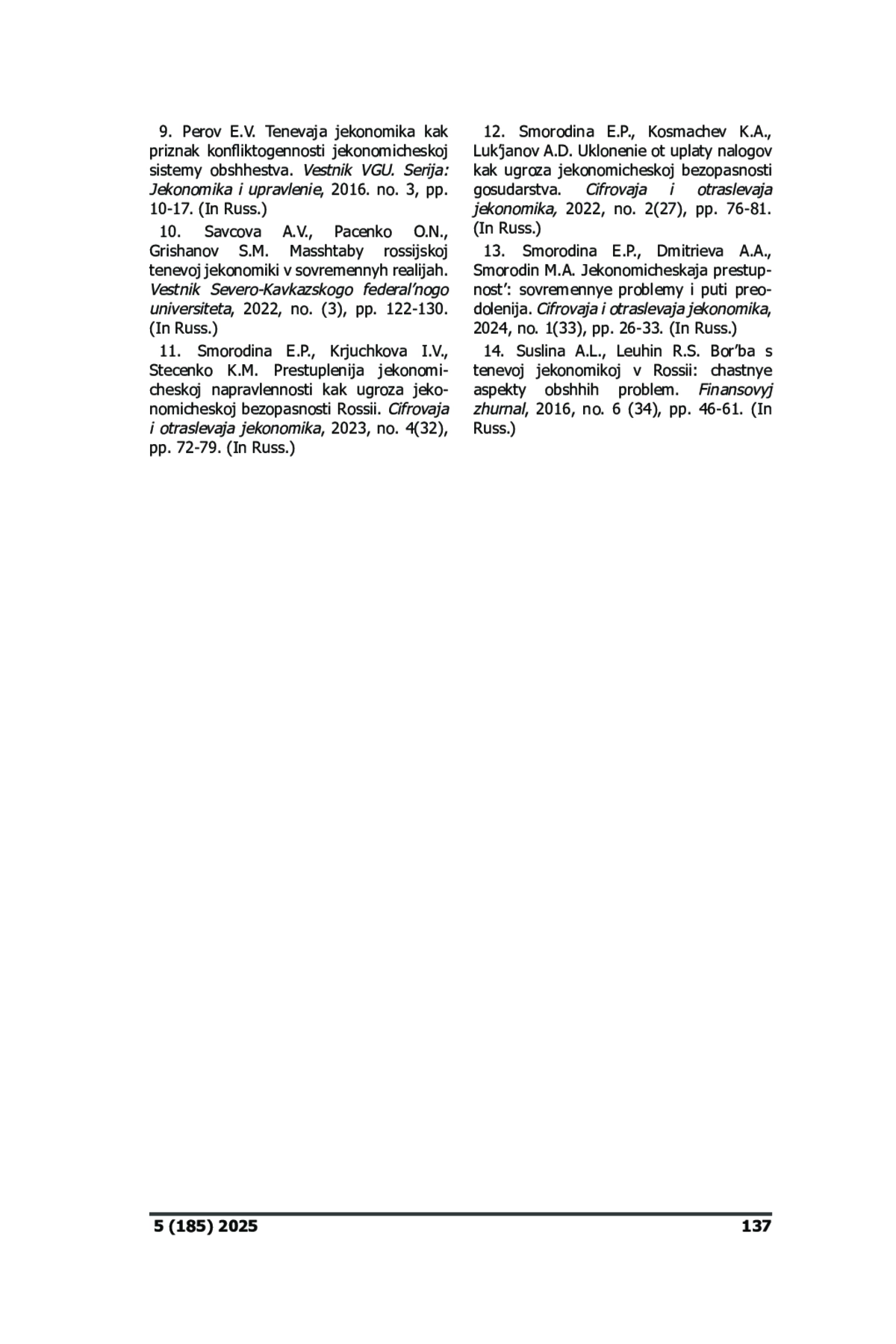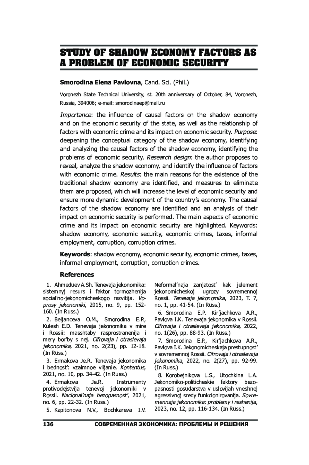 6. Смородина Е.П. Кирьячкова А.Р., Павлова И.К. Теневая экономика в России // Цифровая и отраслевая экономика, 2022, no. 1 (26), с. 88-93. EDN: TXHOTS