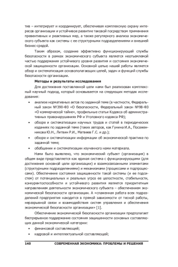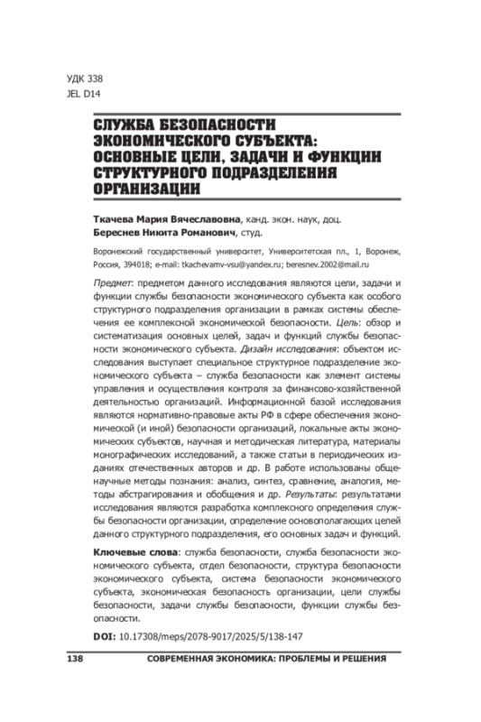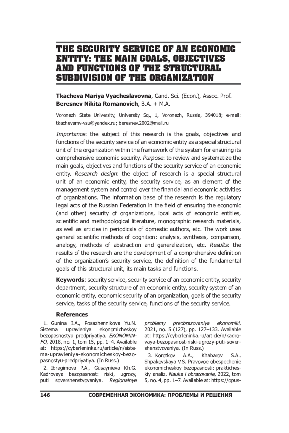 Предмет: предметом данного исследования являются цели, задачи и функции службы безопасности экономического субъекта как особого структурного подразделения организации в рамках системы обеспечения ее комплексной экономической безопасности. Цель: обзор и систематизация основных целей, задач и функций службы безопасности экономического субъекта. Дизайн исследования: объектом исследования выступает специальное структурное подразделение экономического субъекта - служба безопасности как элемент системы управления и осуществления контроля за финансово-хозяйственной деятельностью организаций. Информационной базой исследования являются нормативно-правовые акты РФ в сфере обеспечения экономической (и иной) безопасности организаций, локальные акты экономических субъектов, научная и методическая литература, материалы монографических исследований, а также статьи в периодических изданиях отечественных авторов и др. В работе использованы общенаучные методы познания: анализ, синтез, сравнение, аналогия, методы абстрагирования и обобщения и др. Результаты: результатами исследования являются разработка комплексного определения службы безопасности организации, определение основополагающих целей данного структурного подразделения, его основных задач и функций.
