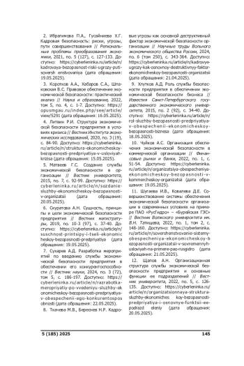 2. Ибрагимова П.А., Гусайниева Х.Г. Кадровая безопасность: риски, угрозы, пути совершенствования // Региональные проблемы преобразования экономики, 2021, no. 5 (127), с. 127-133. Доступно: https://cyberleninka.ru/article/n/kadrovaya-bezopasnost-riski-ugrozy-puti-soversh enstvovaniya (дата обращения: 19.05.2025). EDN: FOBENH