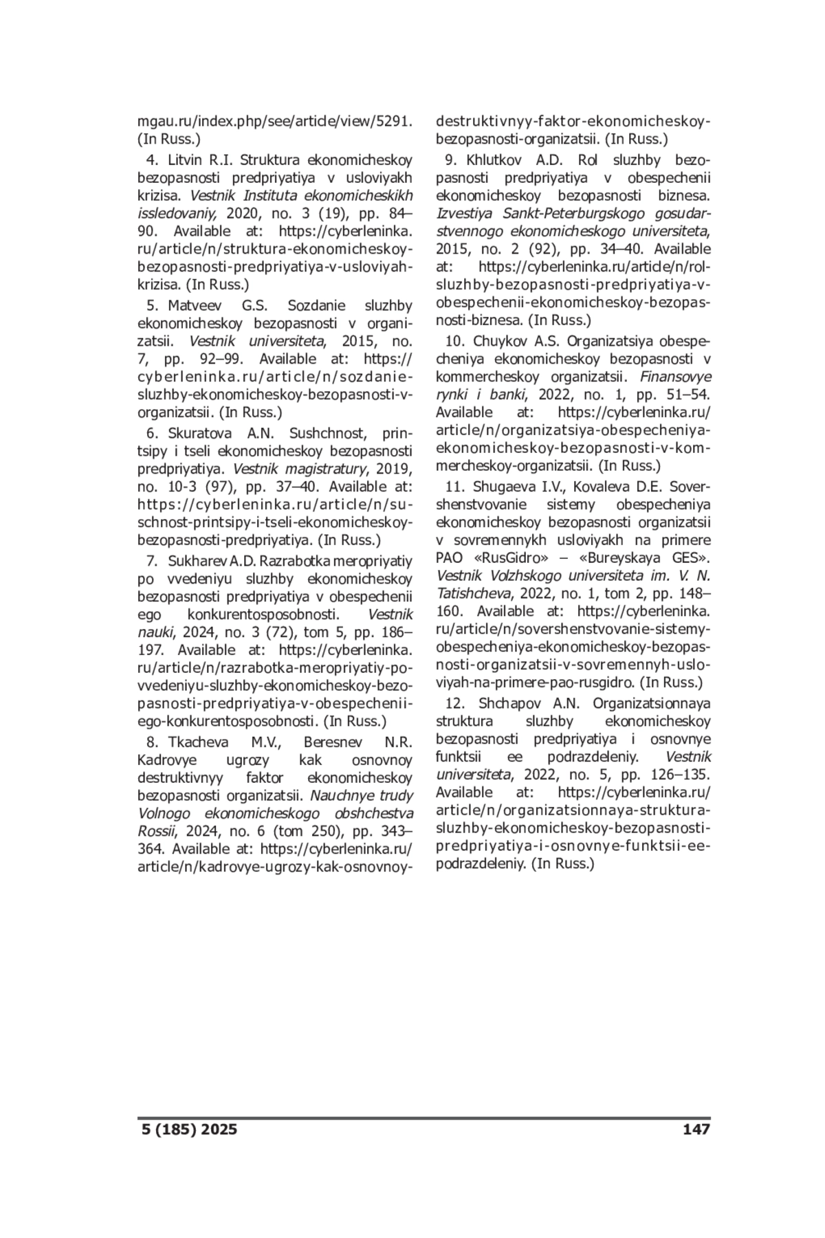 9. Хлутков А.Д. Роль службы безопасности предприятия в обеспечении экономической безопасности бизнеса // Известия Санкт-Петербургского государственного экономического университета, 2015, no. 2 (92), с. 34-40. Доступно: https://cyberleninka.ru/article/n/rol-sluzhby-bezopasnosti-predpriyatiya-v-obespechenii-ekonomicheskoy-bezopasnosti-biznesa (дата обращения: 18.05.2025). EDN: UCLIPD