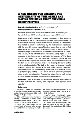 Предмет: слабо стационарные случайные процессы в экономике, реализованные в виде временных рядов. Цель: улучшить метод проверки стационарности по автоковариационной функции, метод проверки стационарности по математическому ожиданию дополнить случаем близкого к нулю среднего значения временного ряда; найти примеры практического применения информации о слабой стационарности. Дизайн исследования: исследование носило теоретический, математико-статистический характер. Проверка корректности полученных результатов осуществлялась на модельных и реальных примерах временных рядов. В том числе на примере котировок акций ЗАО «Татнефть» за короткий период времени. Результаты: новый метод проверки временного ряда на стационарность по автоковариационной функции, а также дополненный метод проверки на стационарность по математическому ожиданию. Исследована проблема выбора подходящего момента для открытия короткой позиции на фондовом рынке. Информацию о стационарности средних значений котировок акций или фьючерсов предлагается использовать как индикатор для принятия решения об открытии короткой позиции. В сочетании с обычными методами технического анализа это может способствовать снижению рисков как для трейдеров, так и для брокеров.