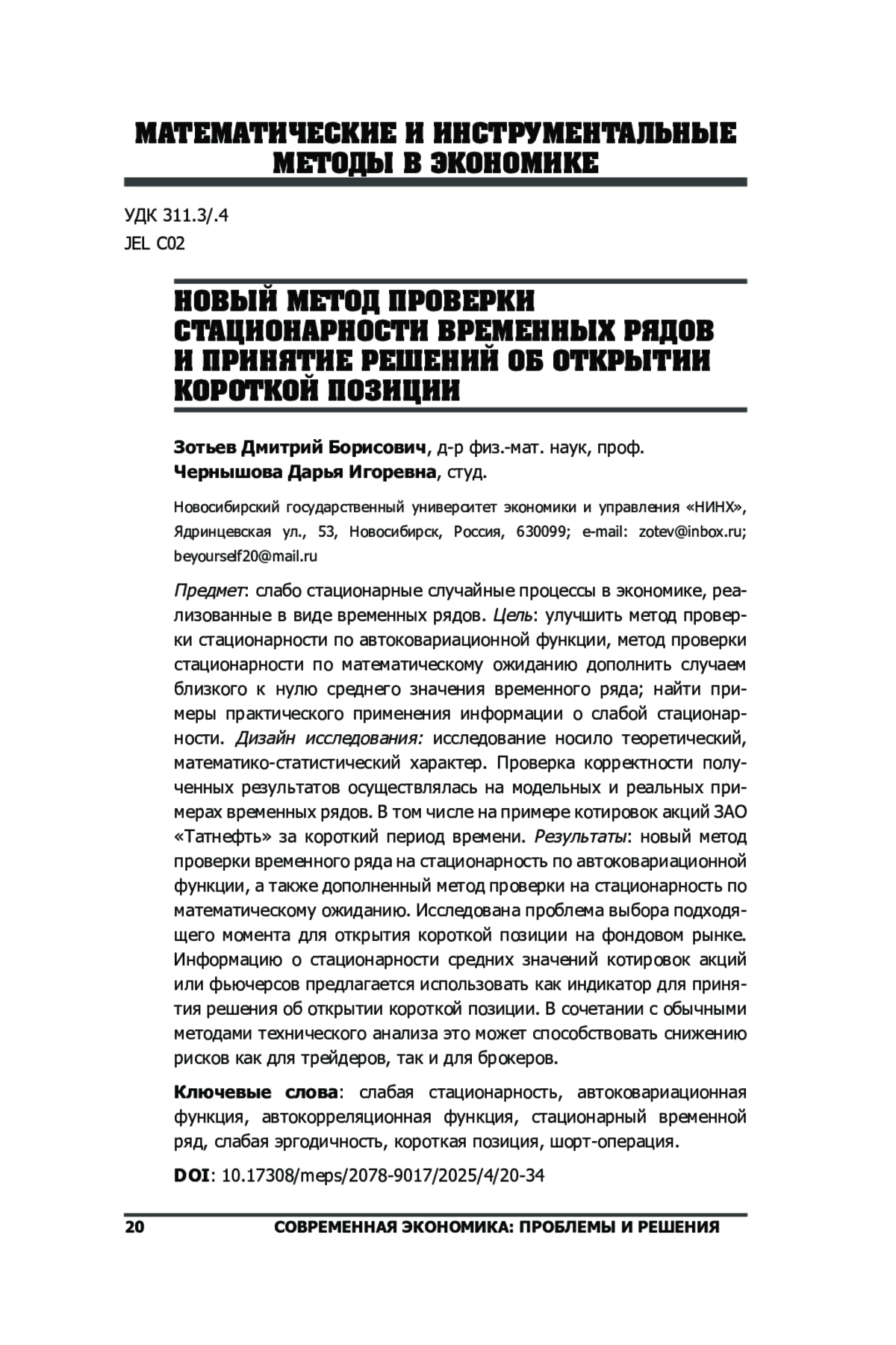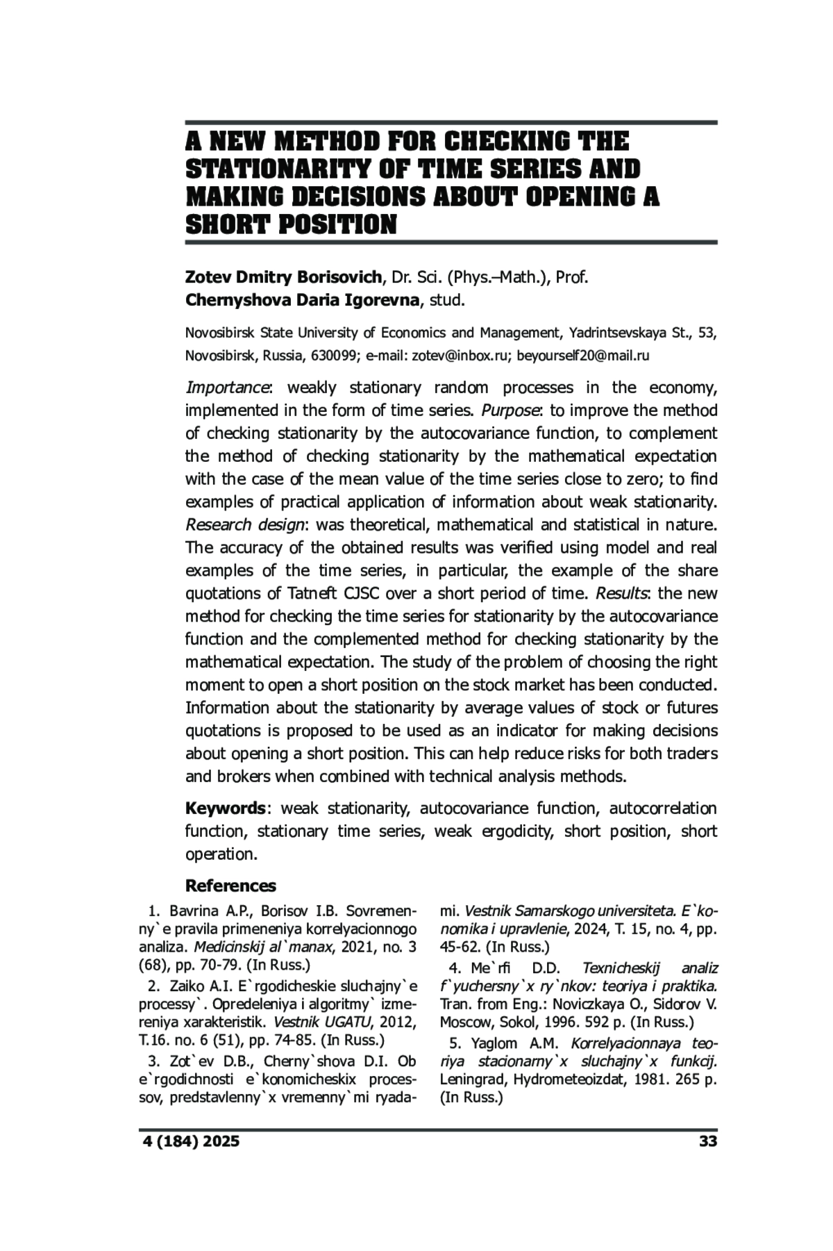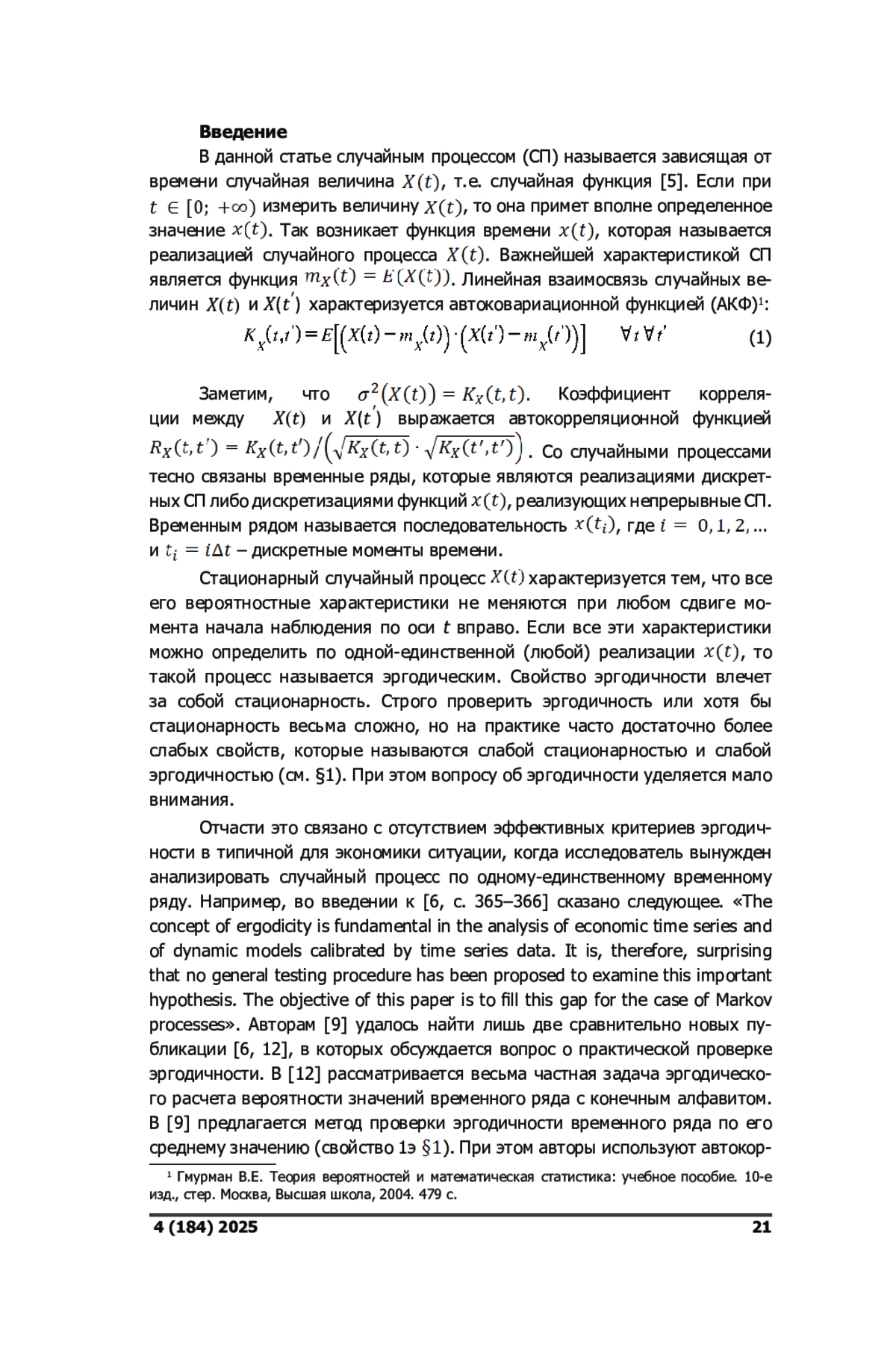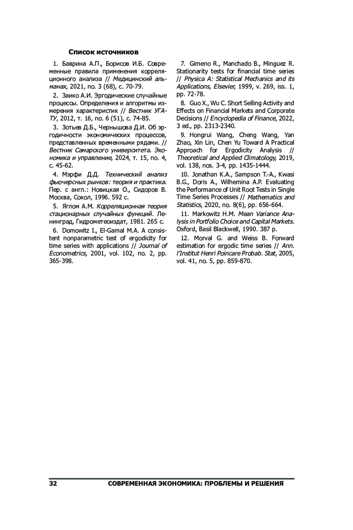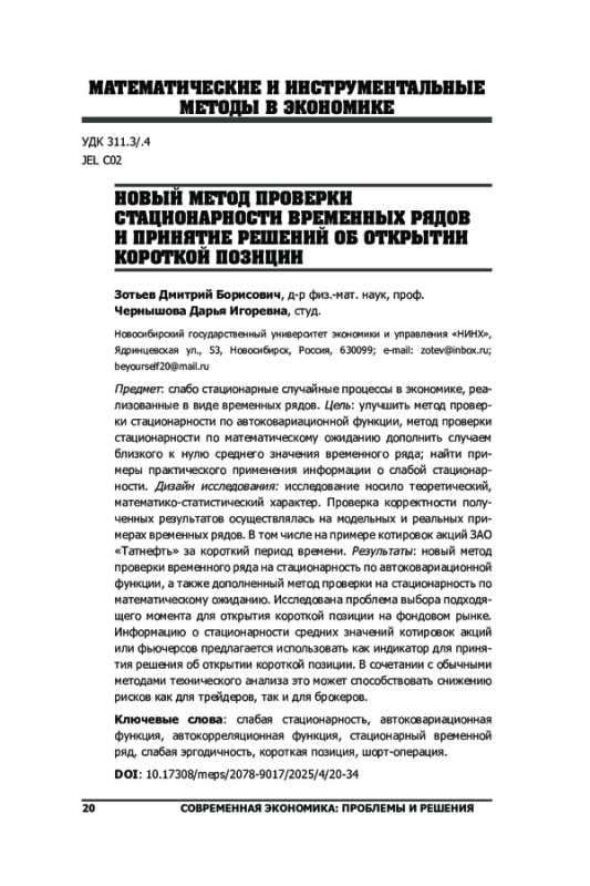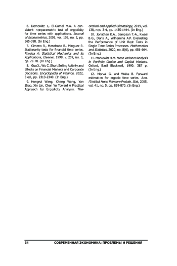 3. Зотьев Д.Б., Чернышова Д.И. Об эргодичности экономических процессов, представленных временными рядами. // Вестник Самарского университета. Экономика и управление, 2024, т. 15, no. 4, с. 45-62. EDN: PVJQQE
