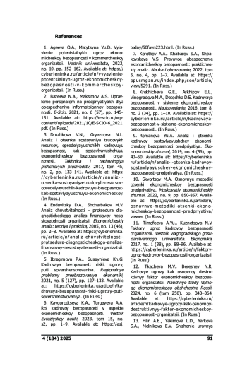 5. Ибрагимова П.А., Гусайниева Х.Г. Кадровая безопасность: риски, угрозы, пути совершенствования // Региональные проблемы преобразования экономики, 2021, no. 5 (127), с. 127-133. Доступно: https://cyberleninka.ru/article/n/kadrovaya-bezopasnost-riski-ugrozy-putisoversh enstvovaniya (дата обращения: 19.04.2025). EDN: FOBENH