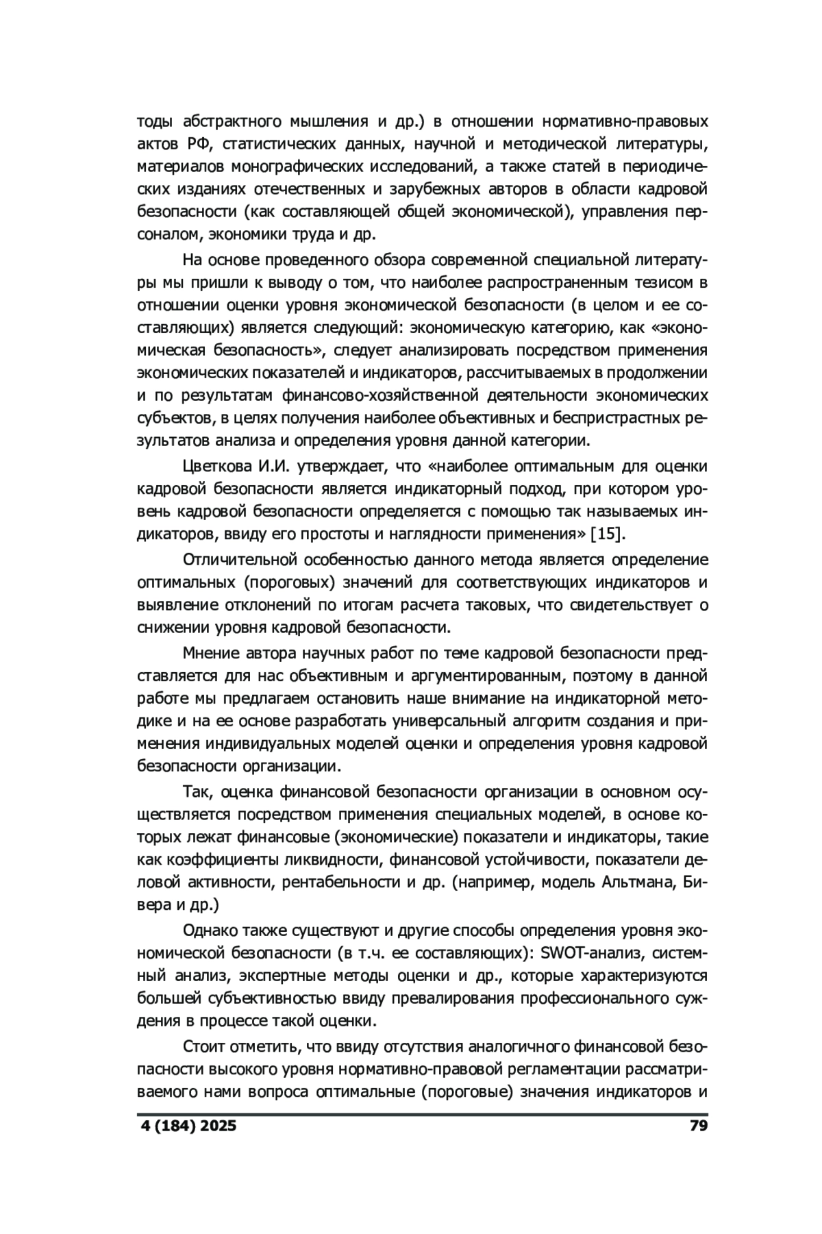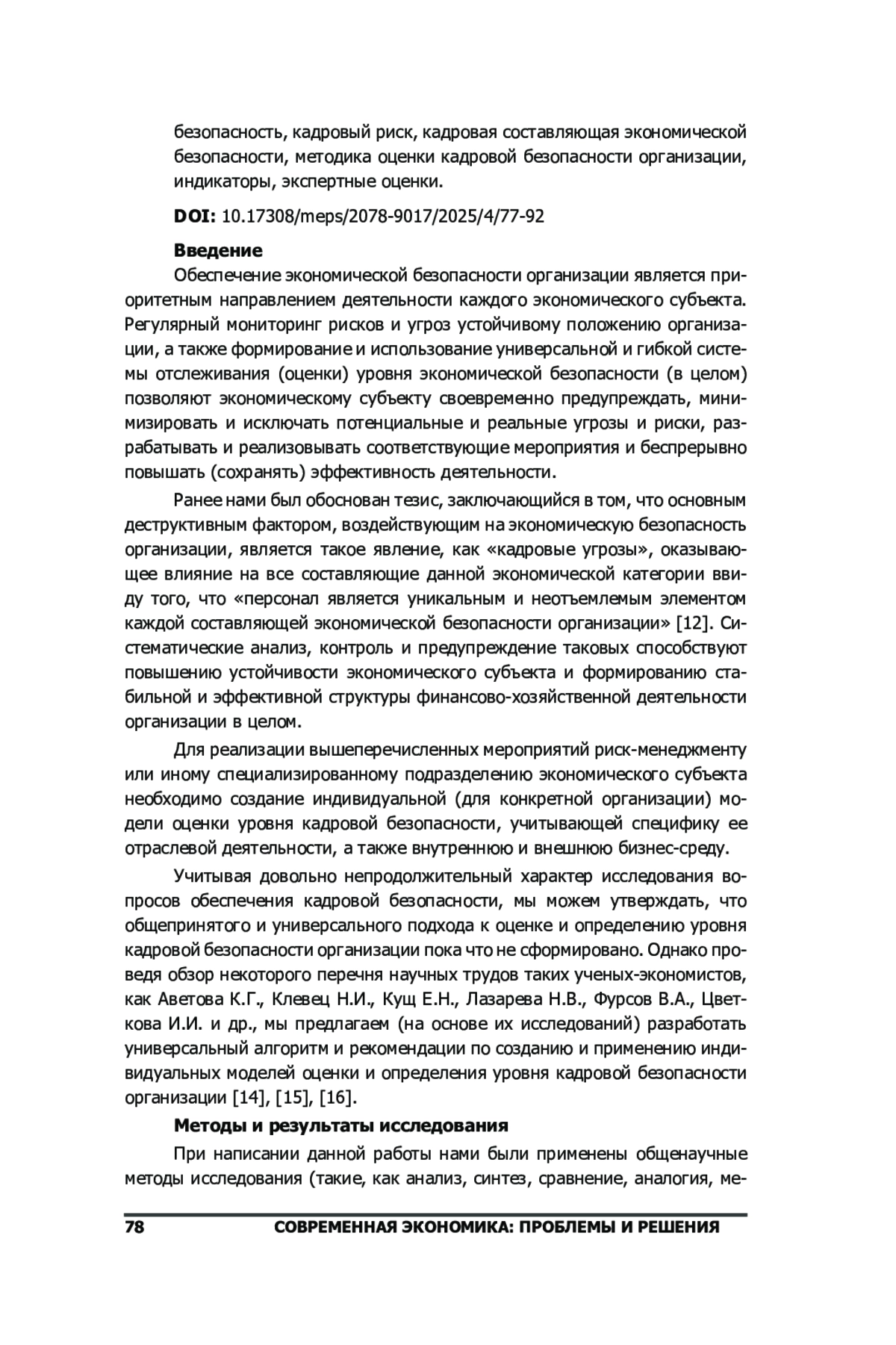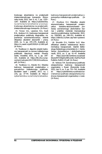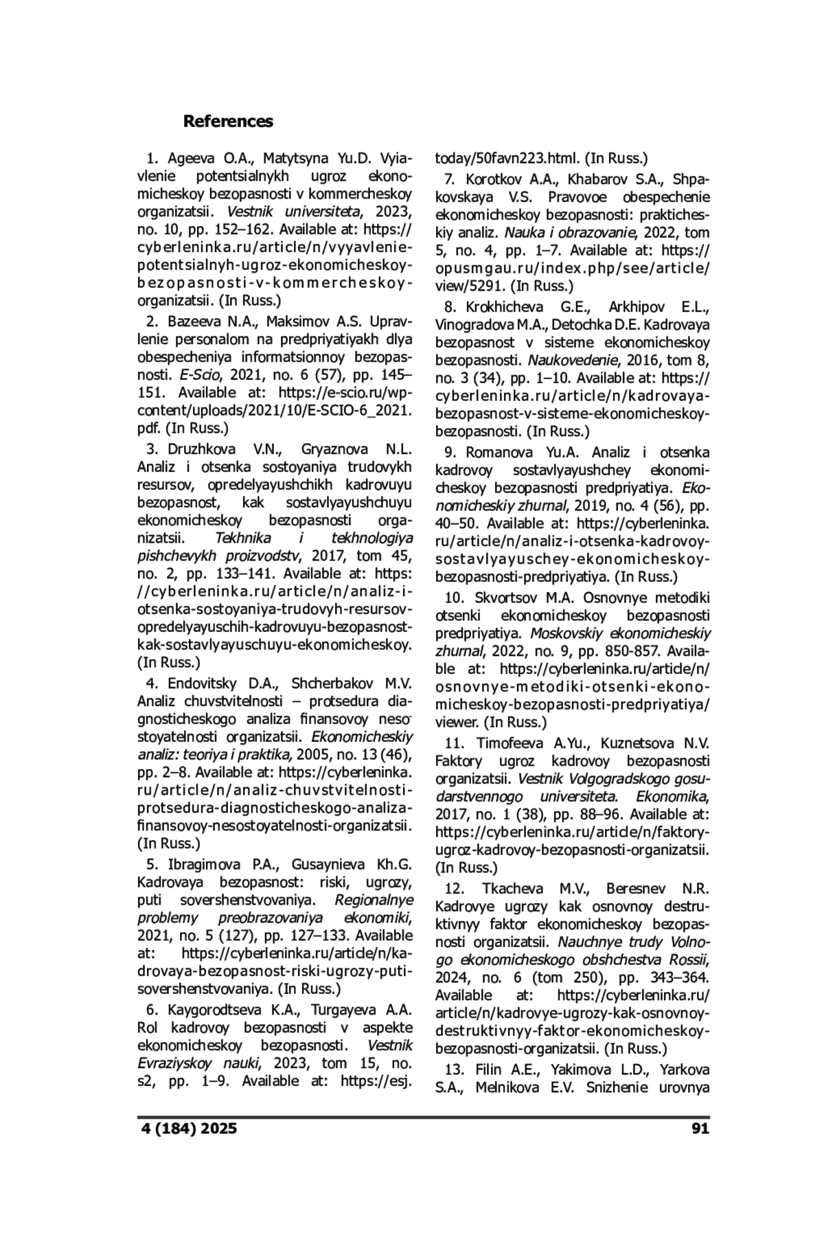 9. Романова Ю.А. Анализ и оценка кадровой составляющей экономической безопасности предприятия // Экономический журнал, 2019, no. 4 (56), с. 40-50. Доступно: https://cyberleninka.ru/article/n/analiz-i-otsenka-kadro voysostavlyayuschey-ekonomicheskoybezopasnosti-predpriyatiya (дата обращения: 26.04.2025).
